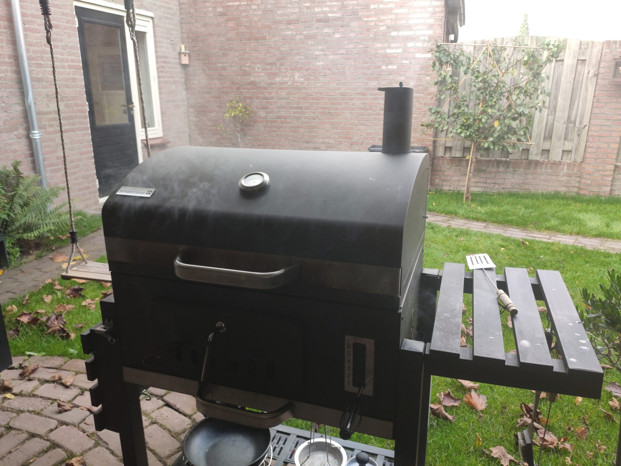 To keep the barbecue at temperature for a long time, Gijs again uses briquettes in a snake setup. Once the barbecue is at temperature, the ribs go on. At the same time, Gijs places a chunk of smoking wood on the coals. For smoking wood, Gijs got beautiful pear wood from G.J. Jolink in Drempt. Pear wood is very similar to apple wood, with a mild, sweet smoke flavor. If you want to cook many ribs, you can use a rib rack so the ribs stand on their sides and more ribs fit in the barbecue.