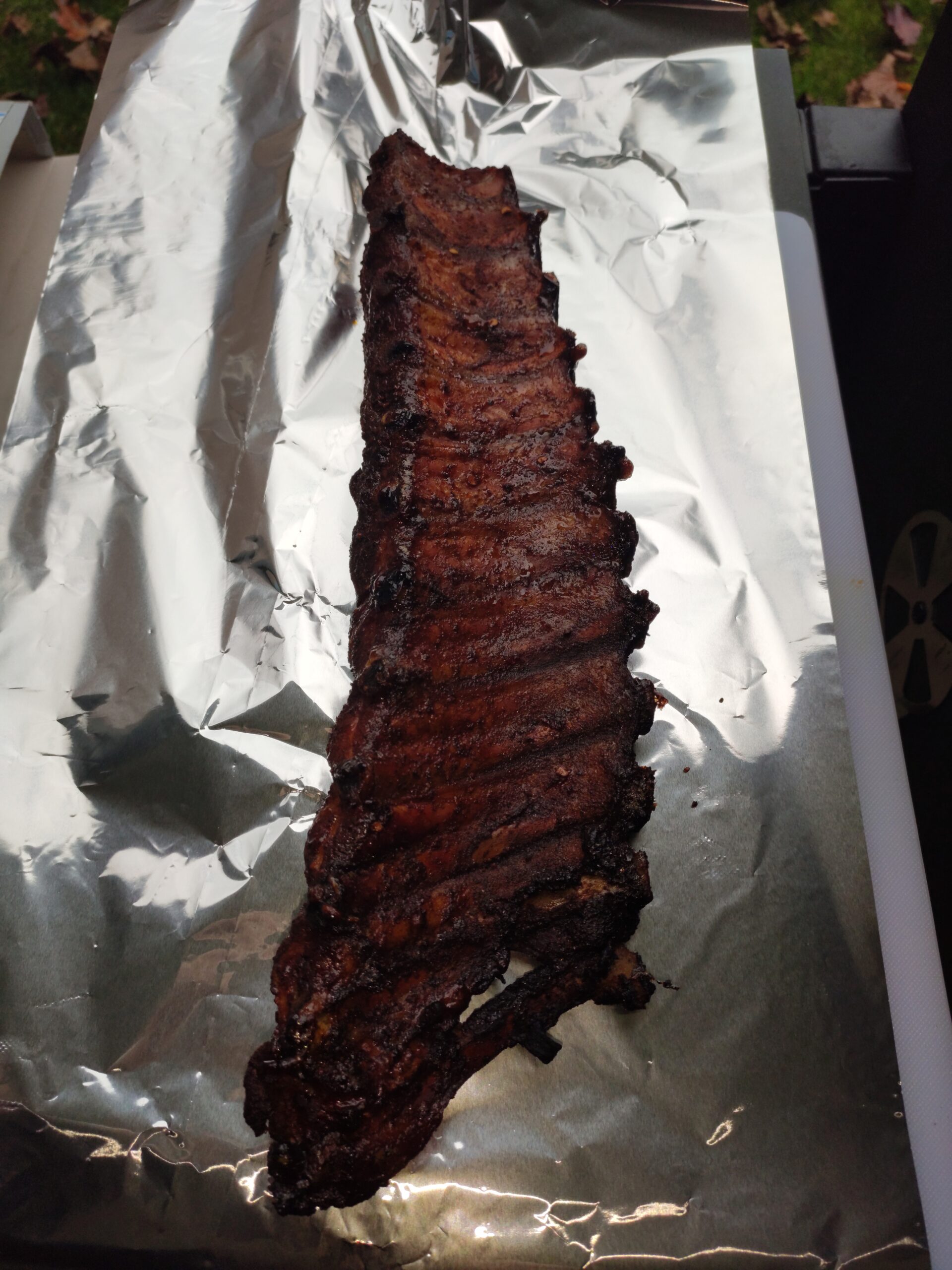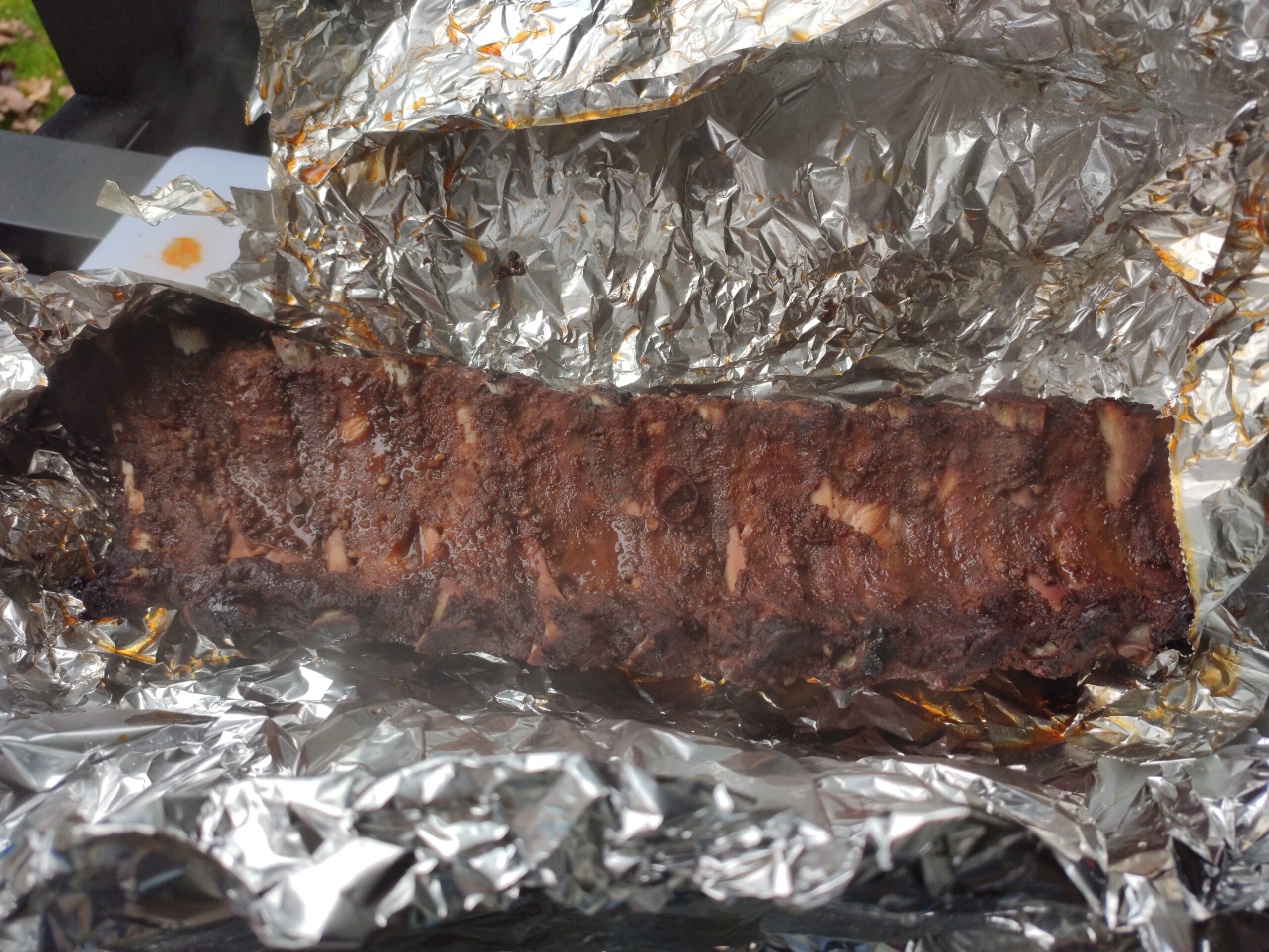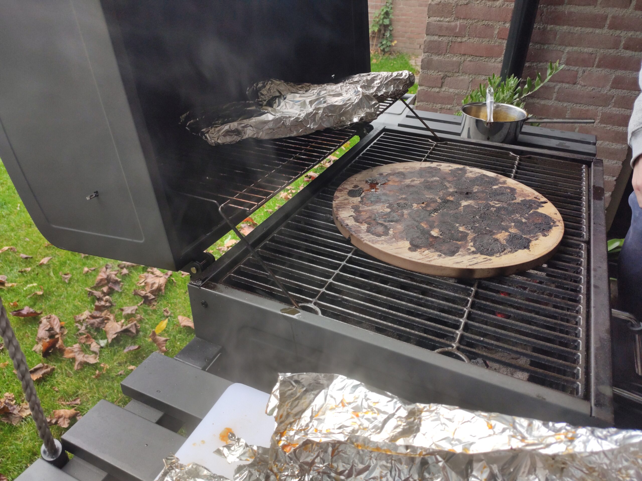 Once wrapped, Gijs puts the ribs back on the barbecue and lets them cook for about another hour. Do not add smoking wood during this phase, because smoke will not pass through the foil anyway. That would just waste good wood.