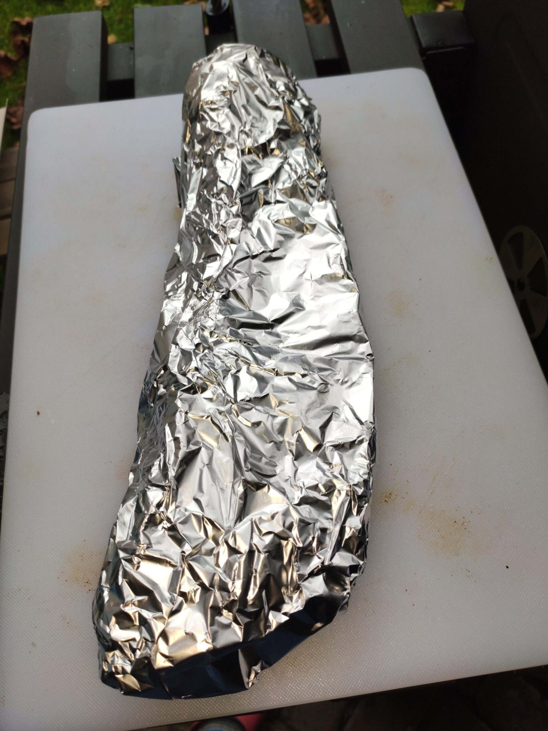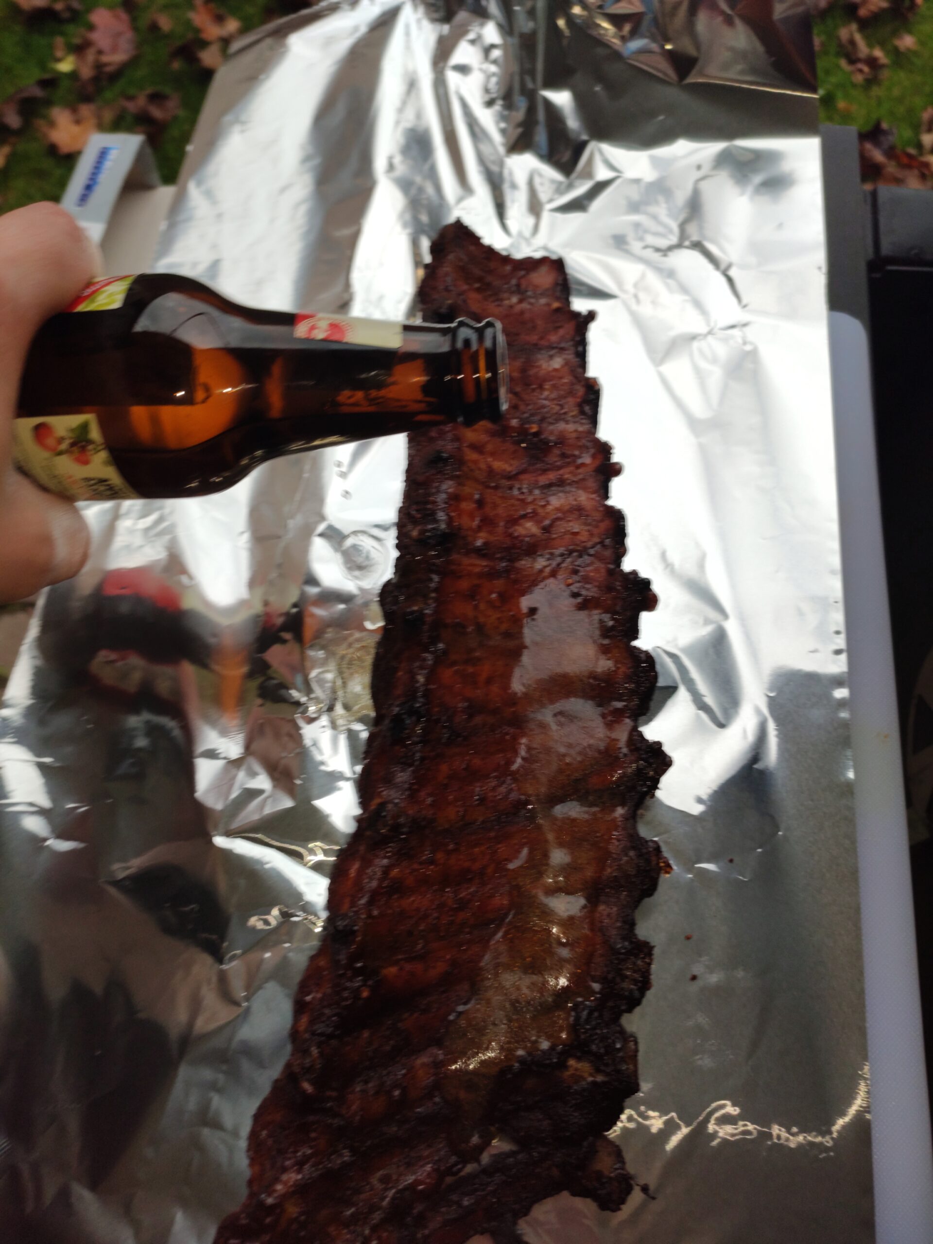 For phase one of the 3-2-1 method, Gijs let the meat cook for 1.5 to 2 hours. For phase two, the meat is wrapped in aluminum foil to prevent drying out. While wrapping, Gijs pours a splash of apple cider over the ribs. Because the cider is trapped in the foil with the meat, the ribs are basically steamed in cider. This gives them a delicious fruity flavor. If you prefer no alcohol, apple juice also works.