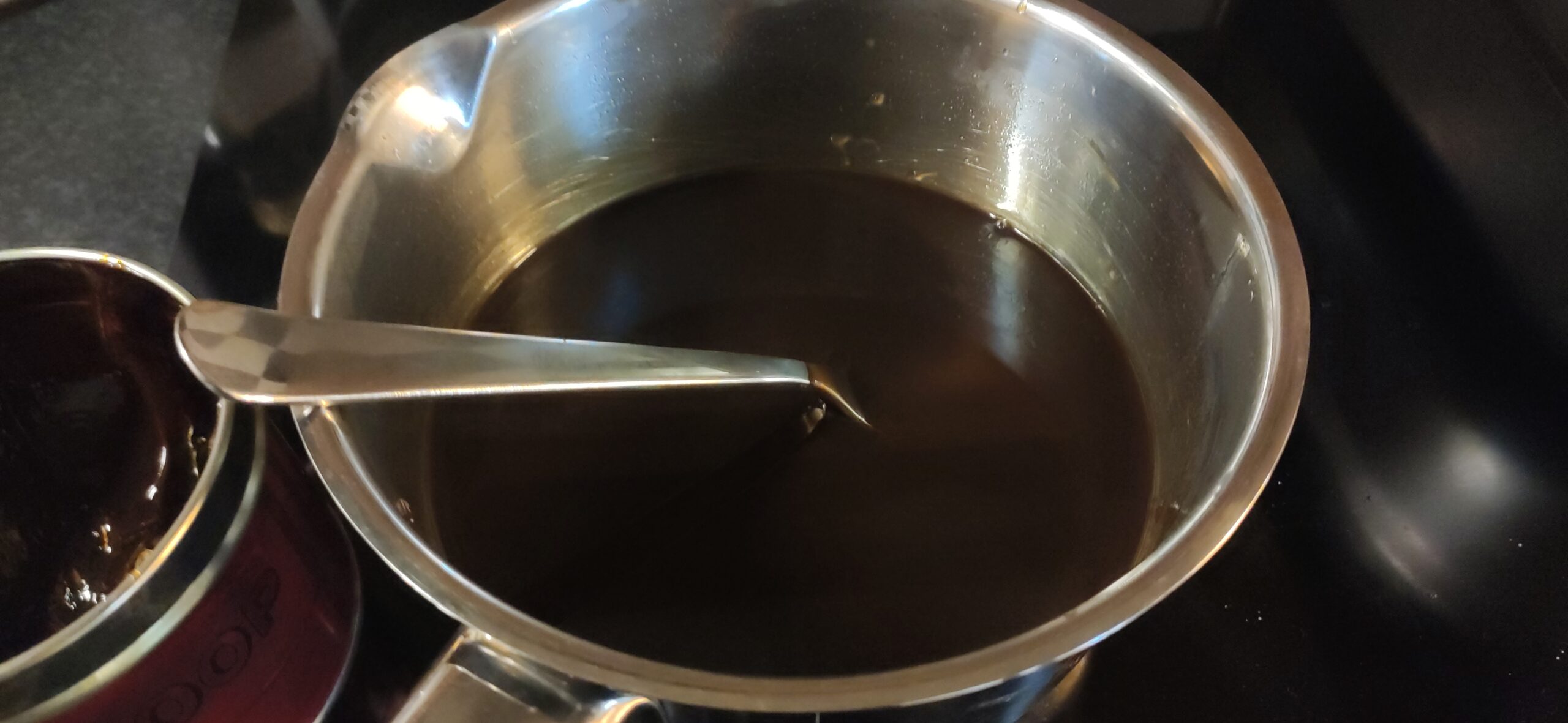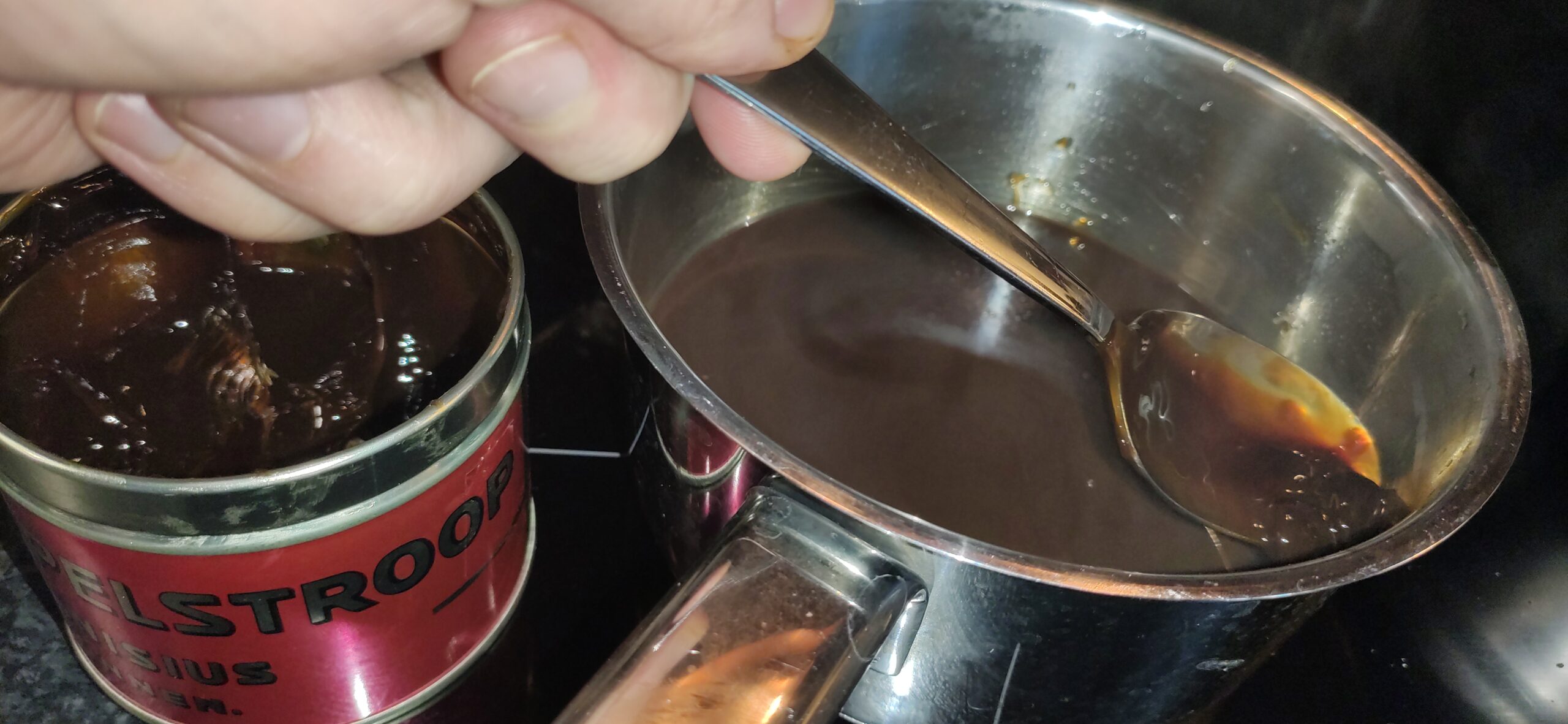 This hour is the perfect moment to make the mop sauce. Do it in time, because the sauce needs to cool down to thicken. For these ribs, Gijs uses a simple sauce based on soy sauce, ketjap manis, and apple syrup. In a saucepan, mix 100 ml soy sauce, 150 ml ketjap manis, 4 big tablespoons apple syrup, 75 ml apple cider, and hot sauce to taste. Bring it to a boil while stirring until smooth. Once the sauce starts boiling, Gijs turns off the heat and lets it cool down and thicken.