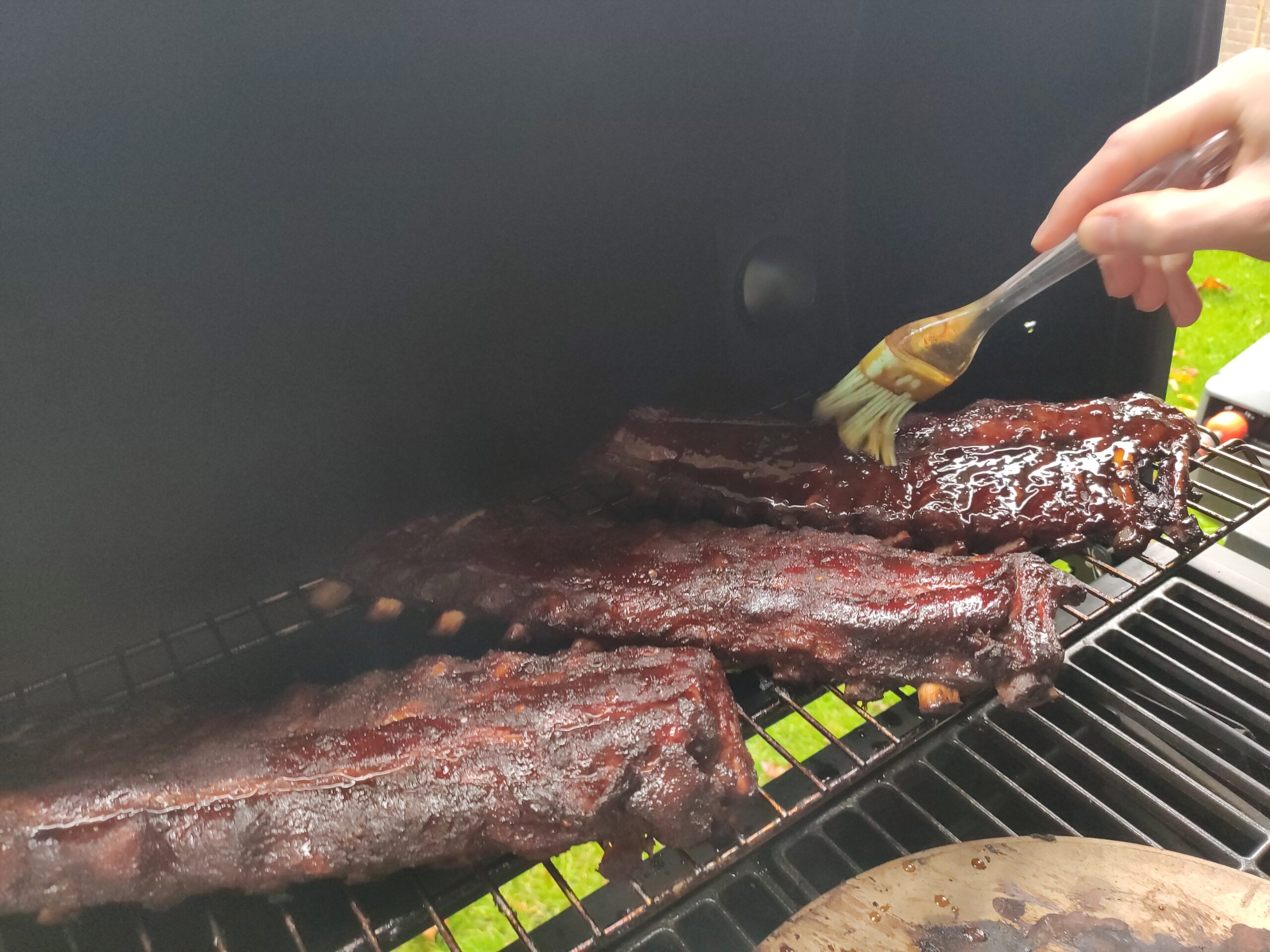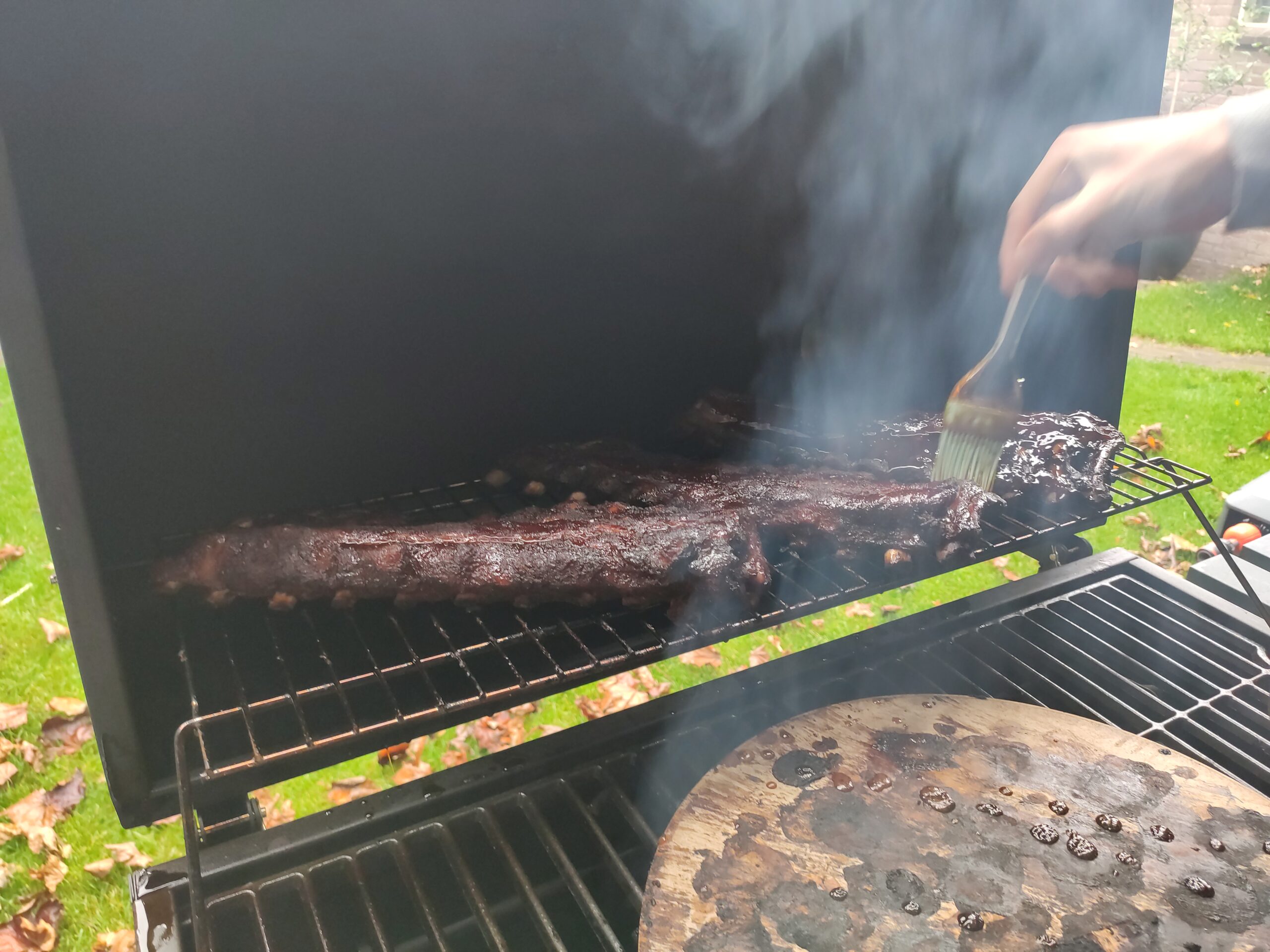 After an hour of steaming, Gijs takes the ribs out of the foil, and the smell is phenomenal. Now the final phase begins: place the ribs back on the barbecue without foil for another 30 to 45 minutes and brush them with the mop sauce.
