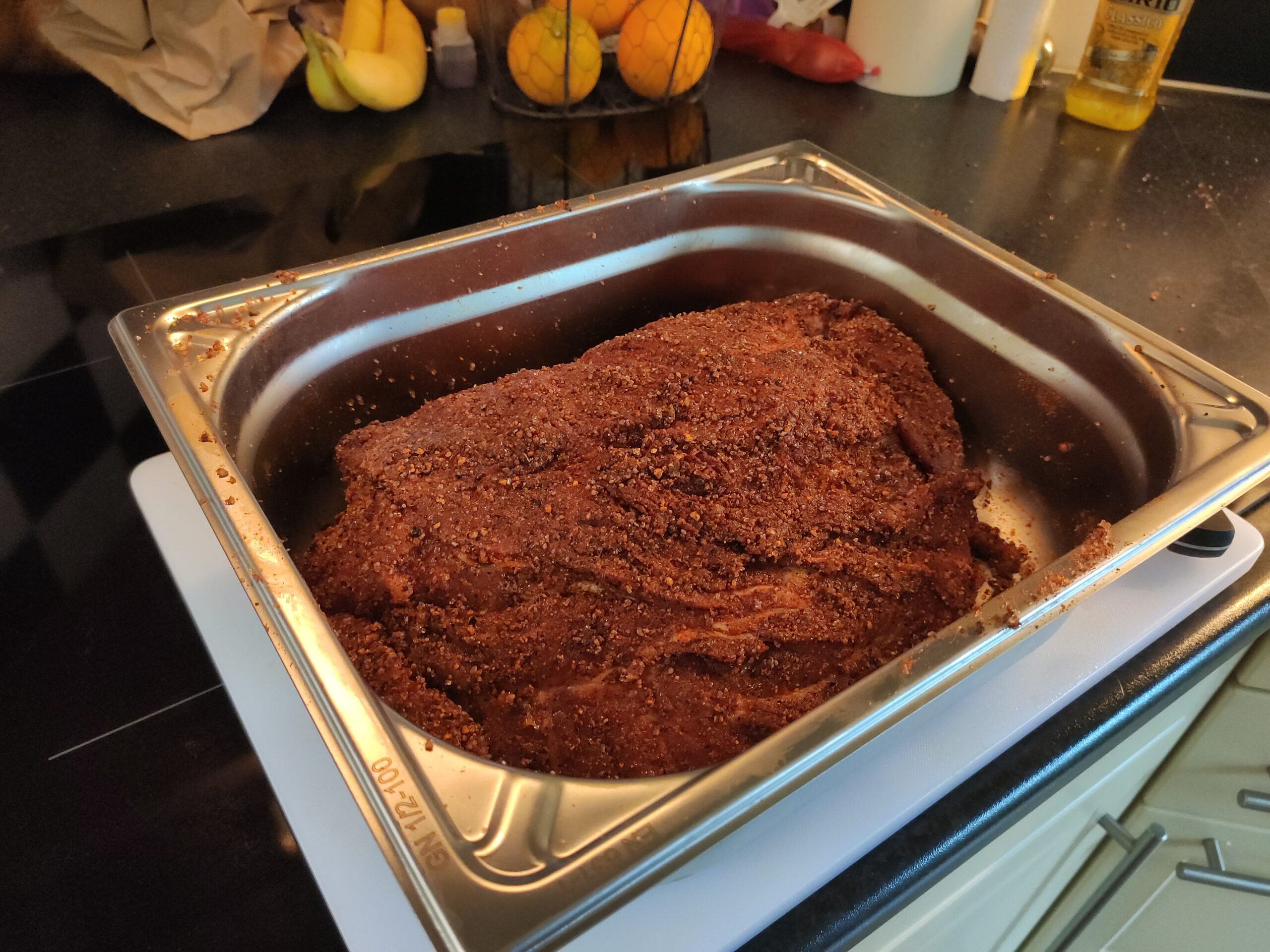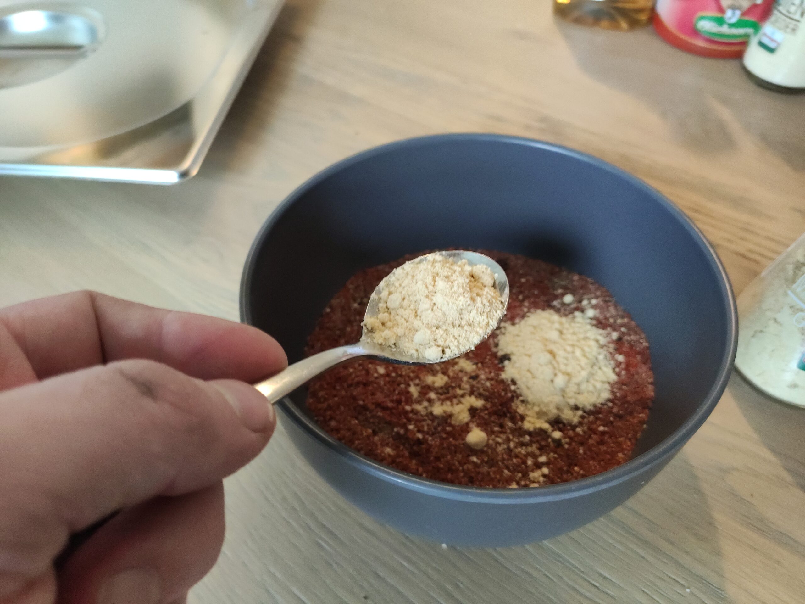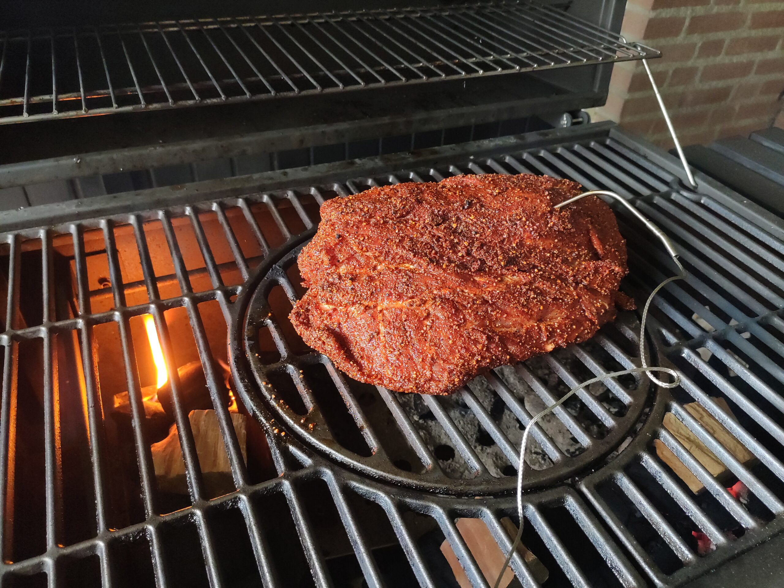 While the barbecue heats up, Gijs has time to make the rub and prep the meat. The easiest step is making the rub: just combine and mix paprika powder, cane sugar, mustard powder, and cayenne pepper. If you want to grind fresh pepper and salt like Gijs, 4 tablespoons suddenly feels like a lot. If you have a Magic Bullet or coffee grinder, you can use that to quickly grind peppercorns and salt.