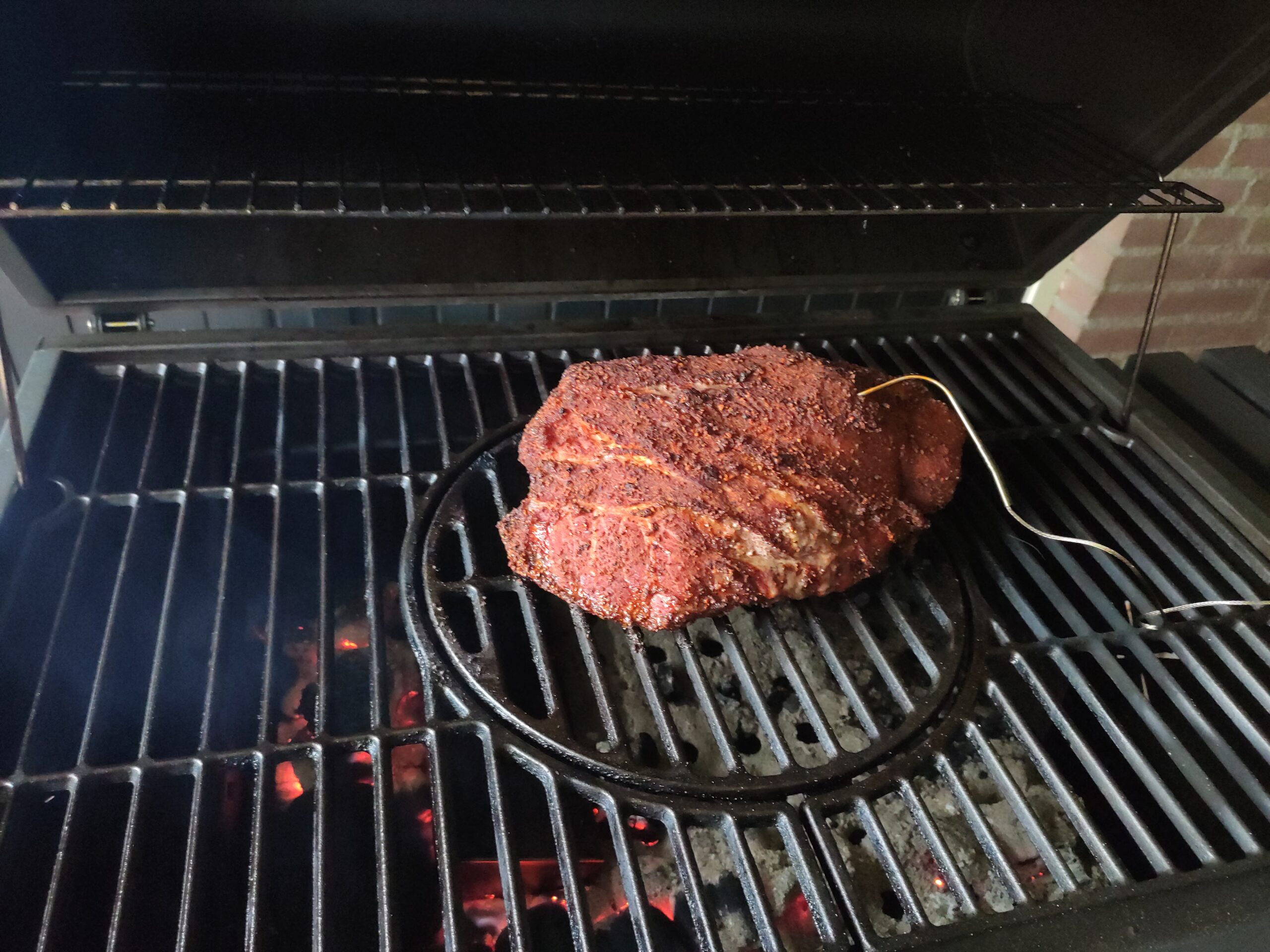 Once coated, the meat should stay on the barbecue for another hour or two. Every cut of meat is different, but during cooking you will hit a point where the internal temperature barely rises. This often happens around 74°C. At that point moisture starts evaporating and the meat can dry out. So Gijs keeps a close eye on the temperature to prevent drying. To monitor this, he uses a core thermometer.