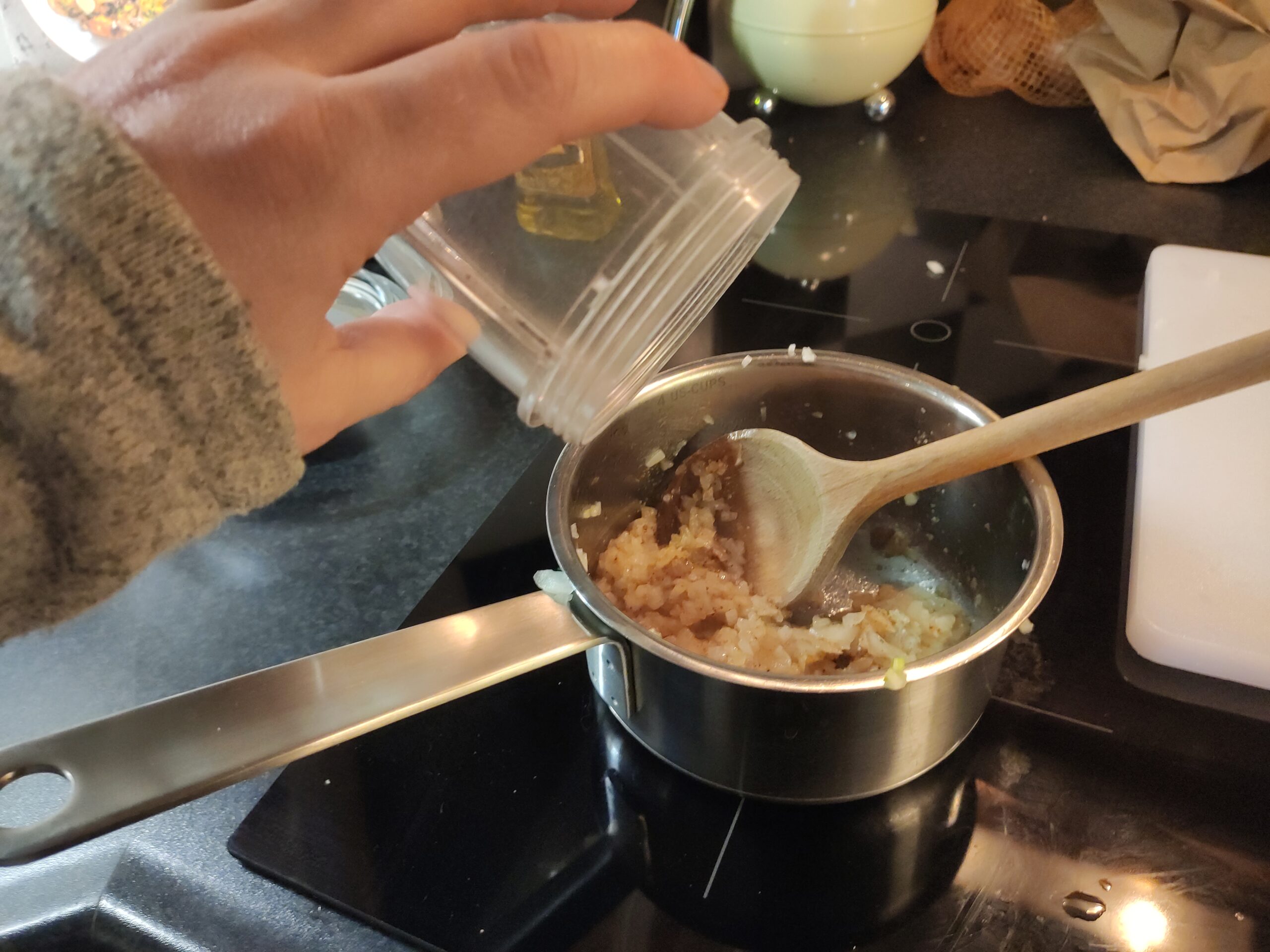 Fry the chopped onion in a medium saucepan with 2 tablespoons of olive oil. Once the onion turns translucent, add fresh garlic while stirring continuously. Let it cook for about one minute, still stirring.
