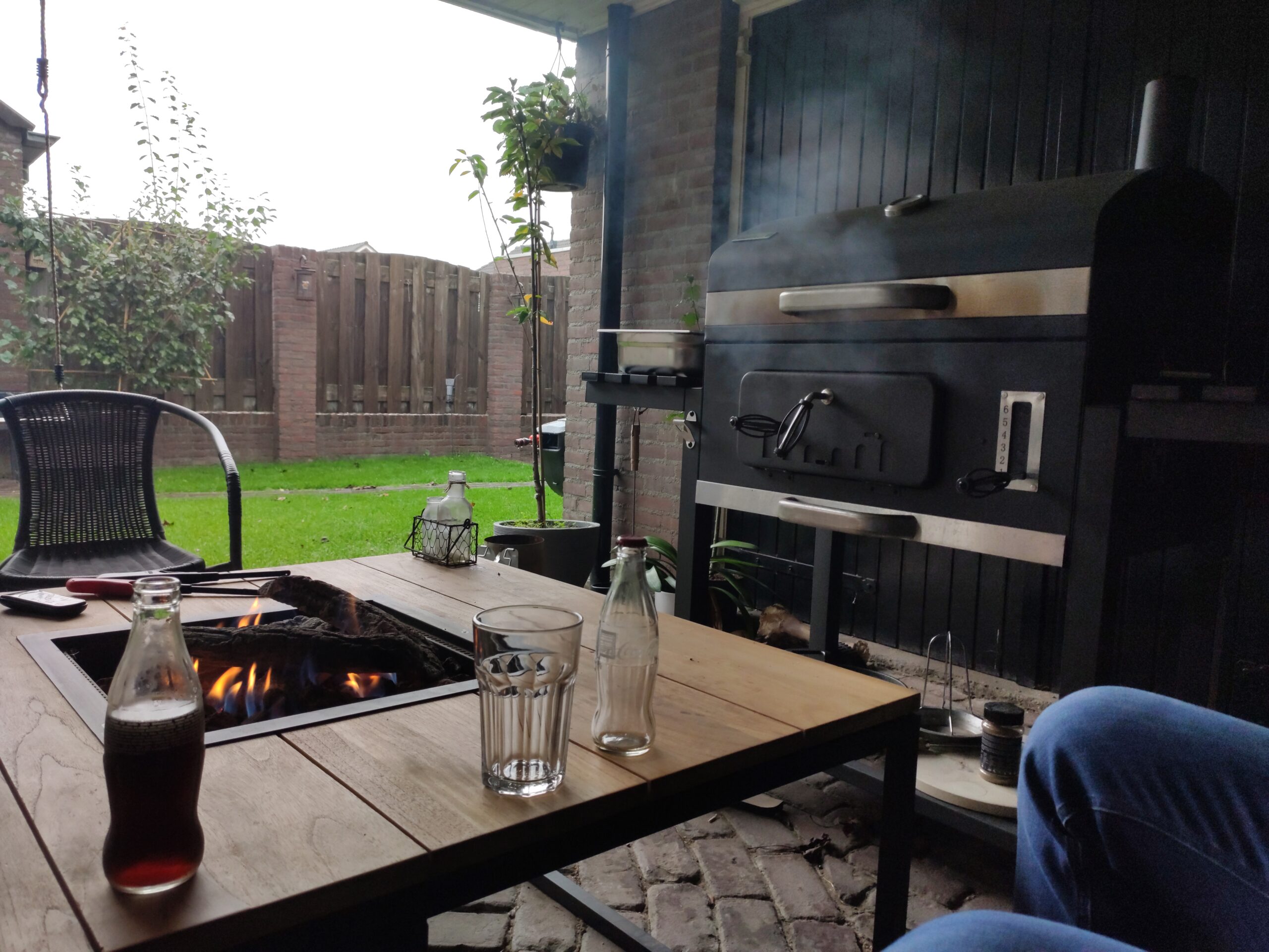 When placing the pork neck, make sure it is not directly above the fire. The goal is to let the meat cook slowly in the smoke. For this, Gijs adds a few larger chunks of smoking wood. For this dish, he chose a mix of cherry and apple wood because it gives a relatively mild flavor.
