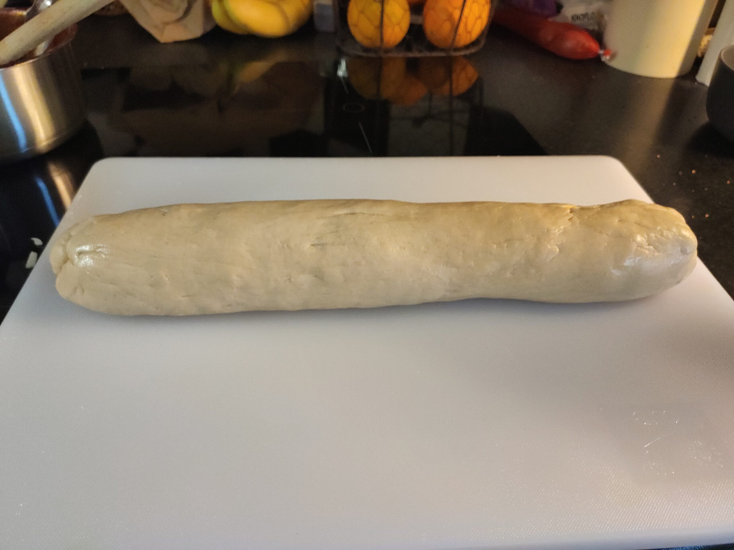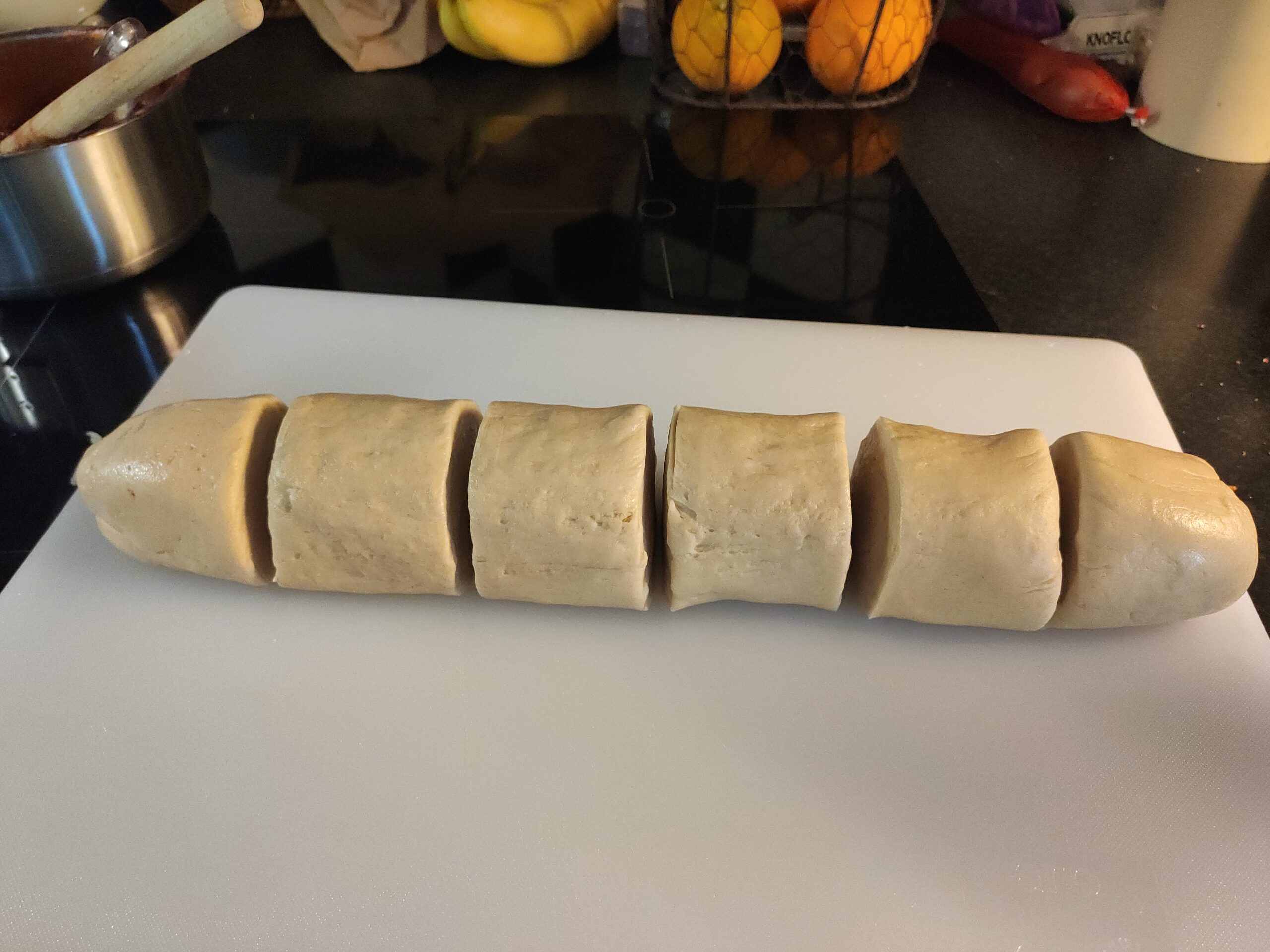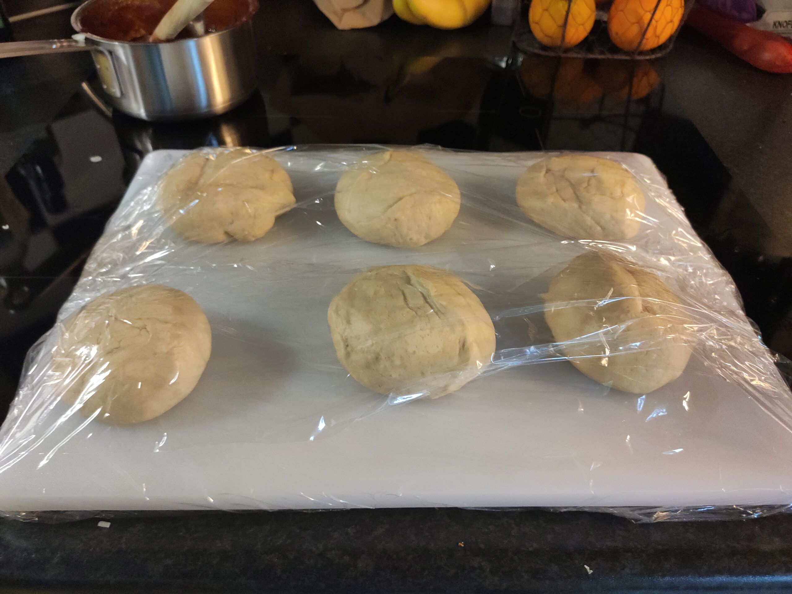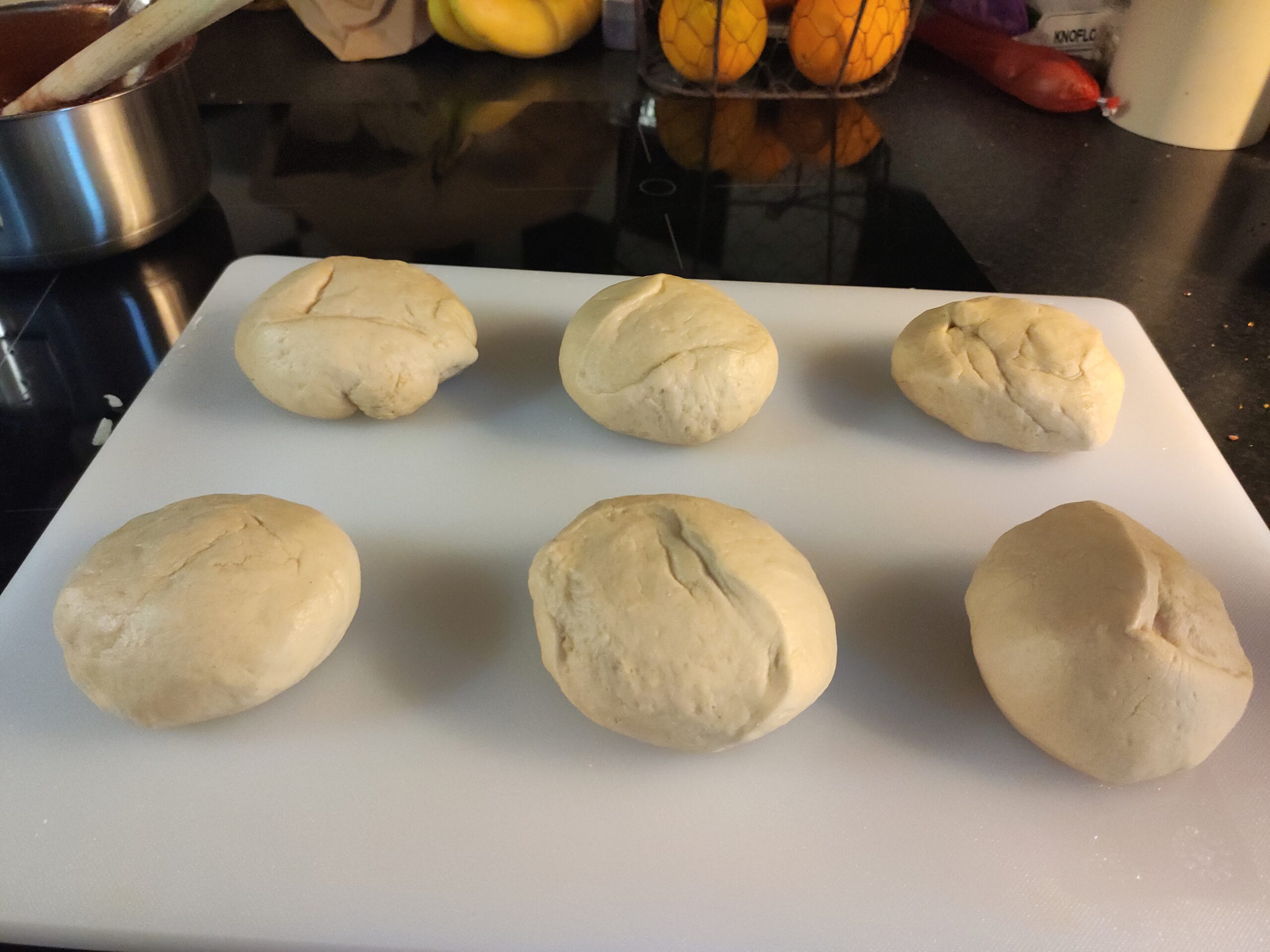 To make neat buns, Gijs rolls the dough into a long log and cuts it into equal pieces. Those pieces are shaped into balls, brushed with a little olive oil, and left to rise for 45 minutes to an hour. Then they can be baked in the oven for about 10 to 15 minutes.