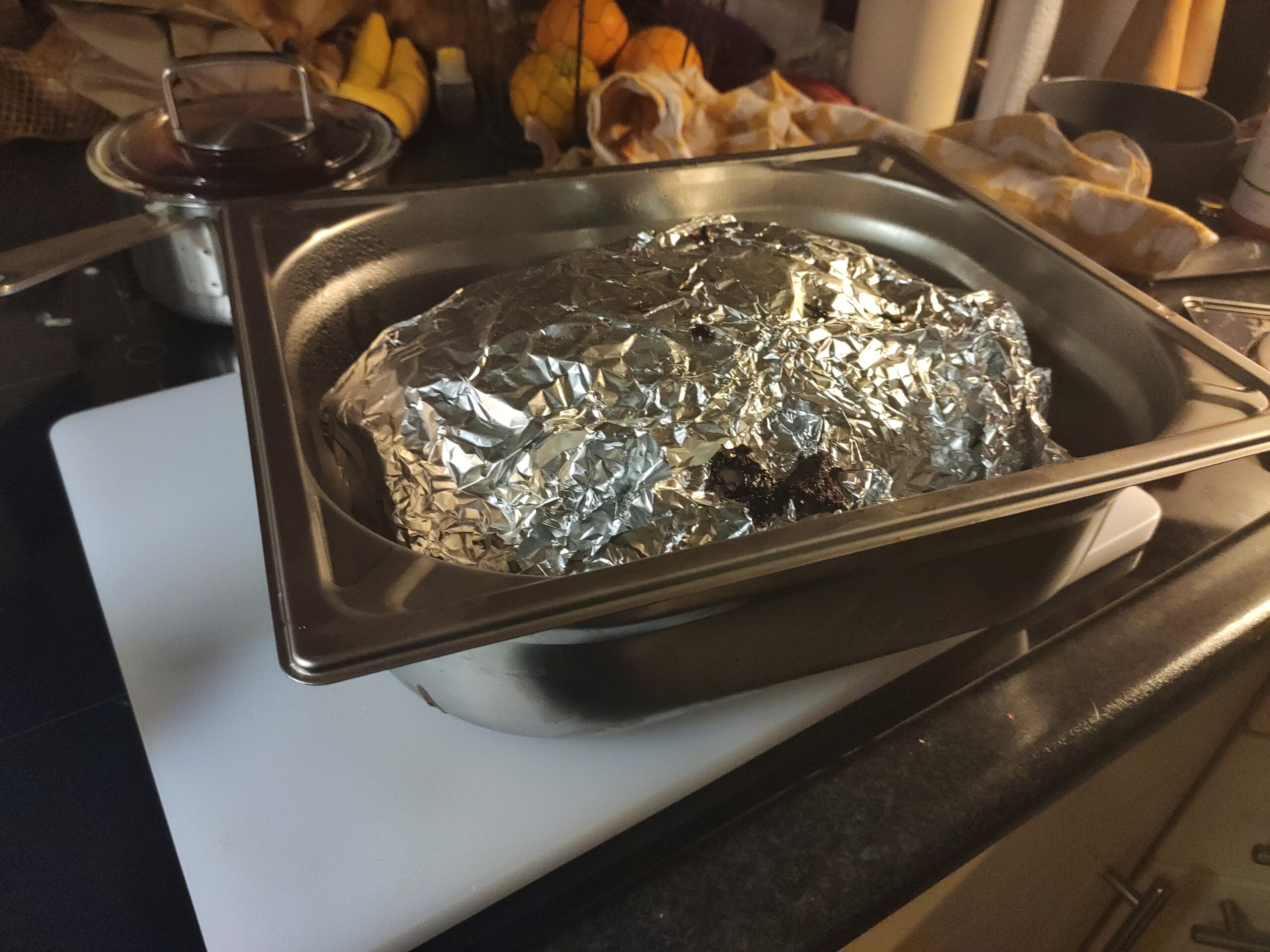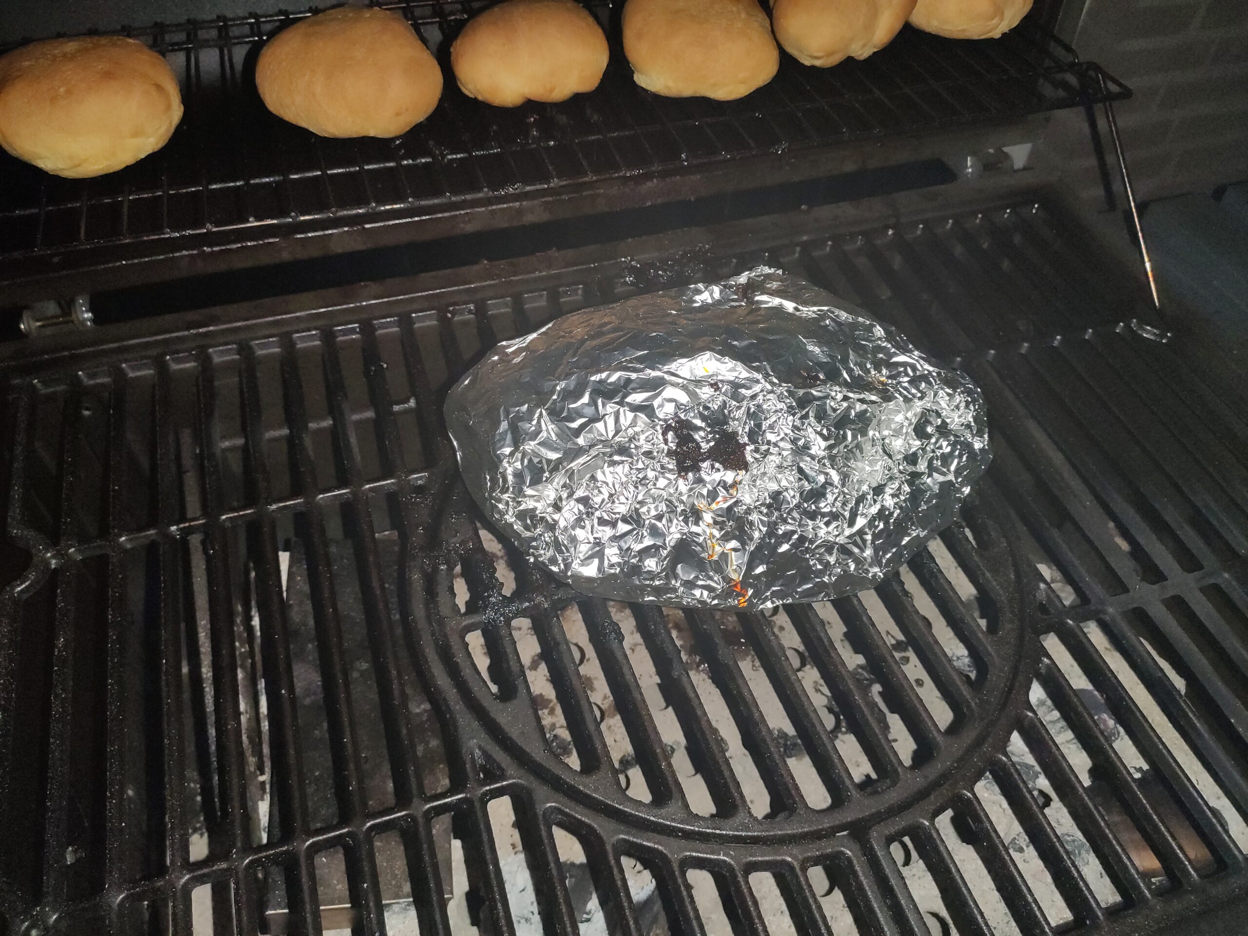 After another 1 to 2 hours, or once the meat reaches a stable core temperature of around 74°C, Gijs wraps the meat in aluminum foil. This helps prevent the meat from drying out. To avoid tearing the foil and losing juices, he uses two solid layers.