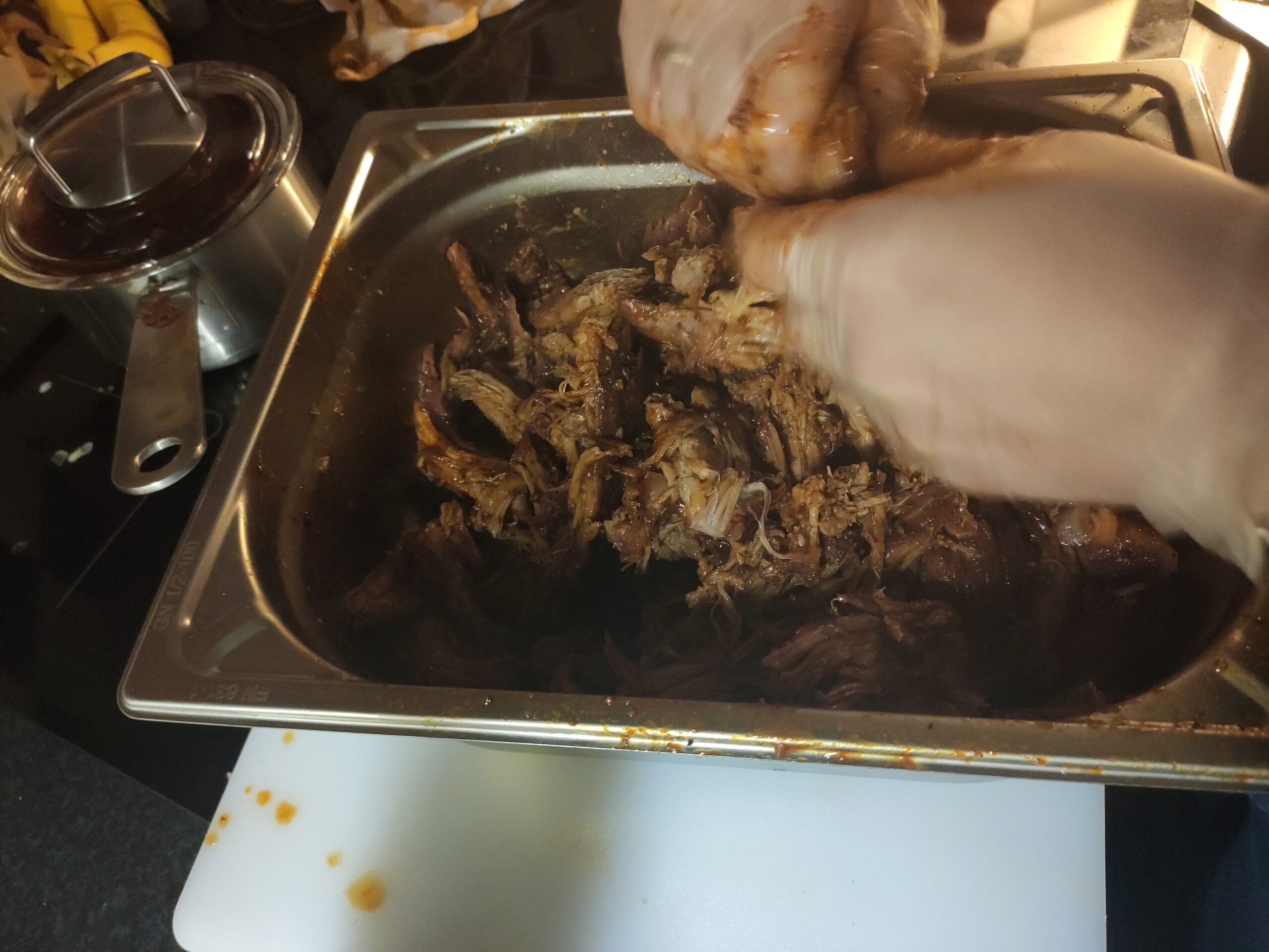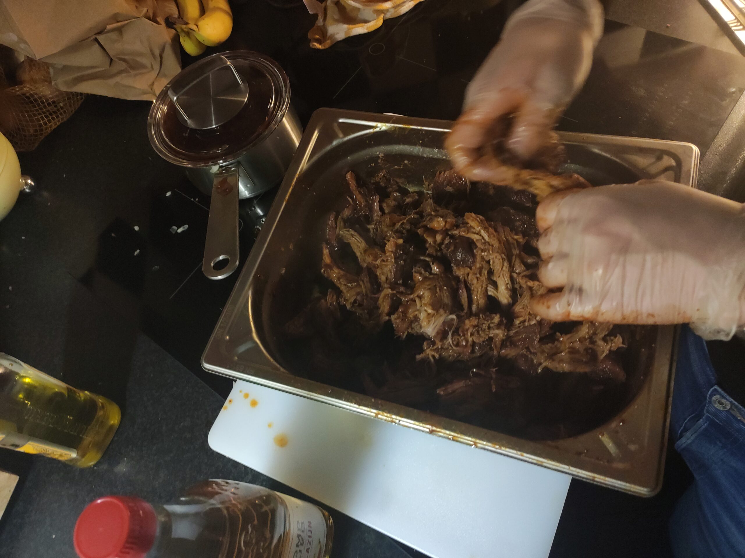 Warning: the pork neck is very hot. From experience, Gijs recommends not pulling it apart with bare hands. He uses two forks, but if you own real meat claws, even better.
