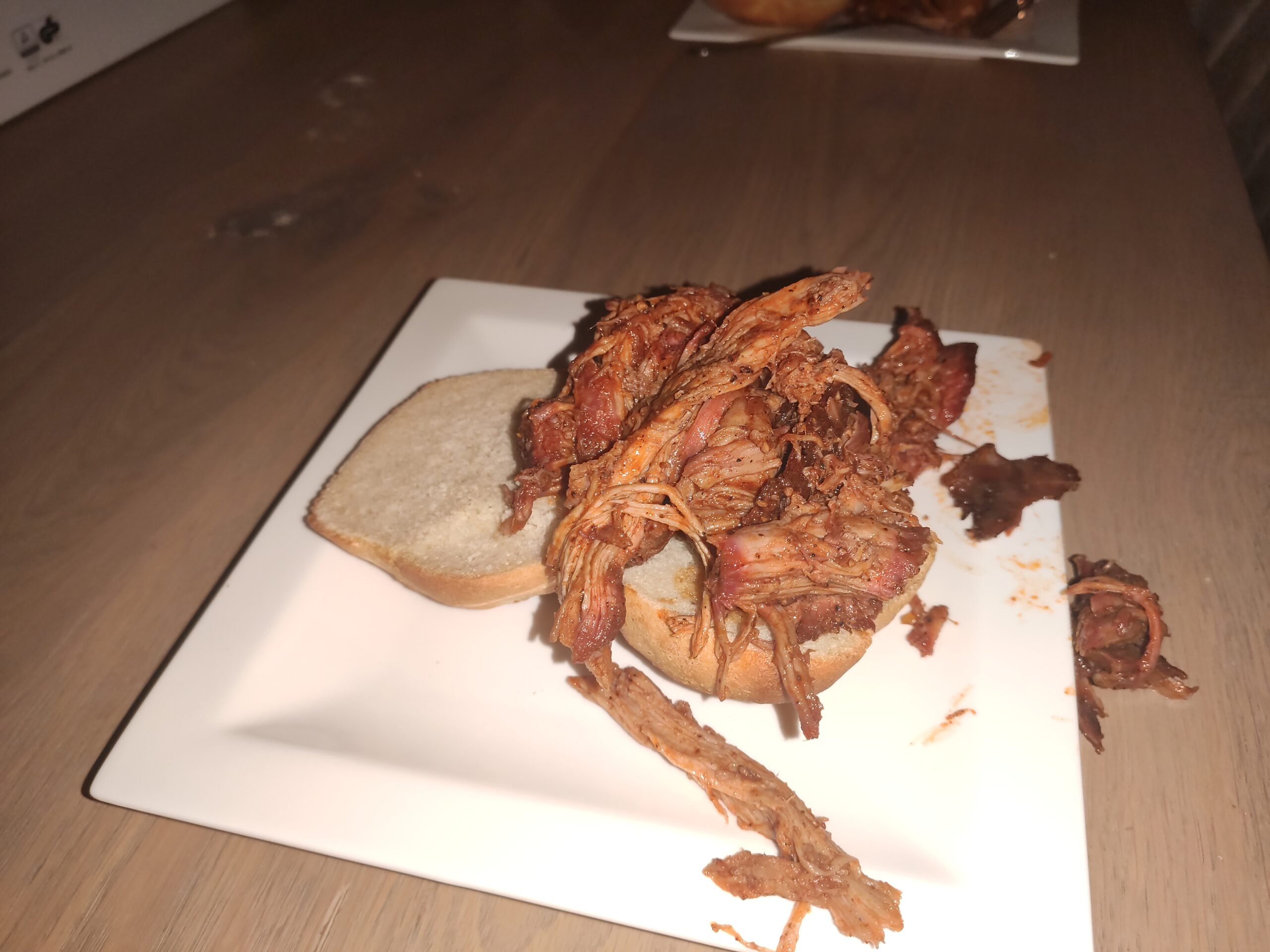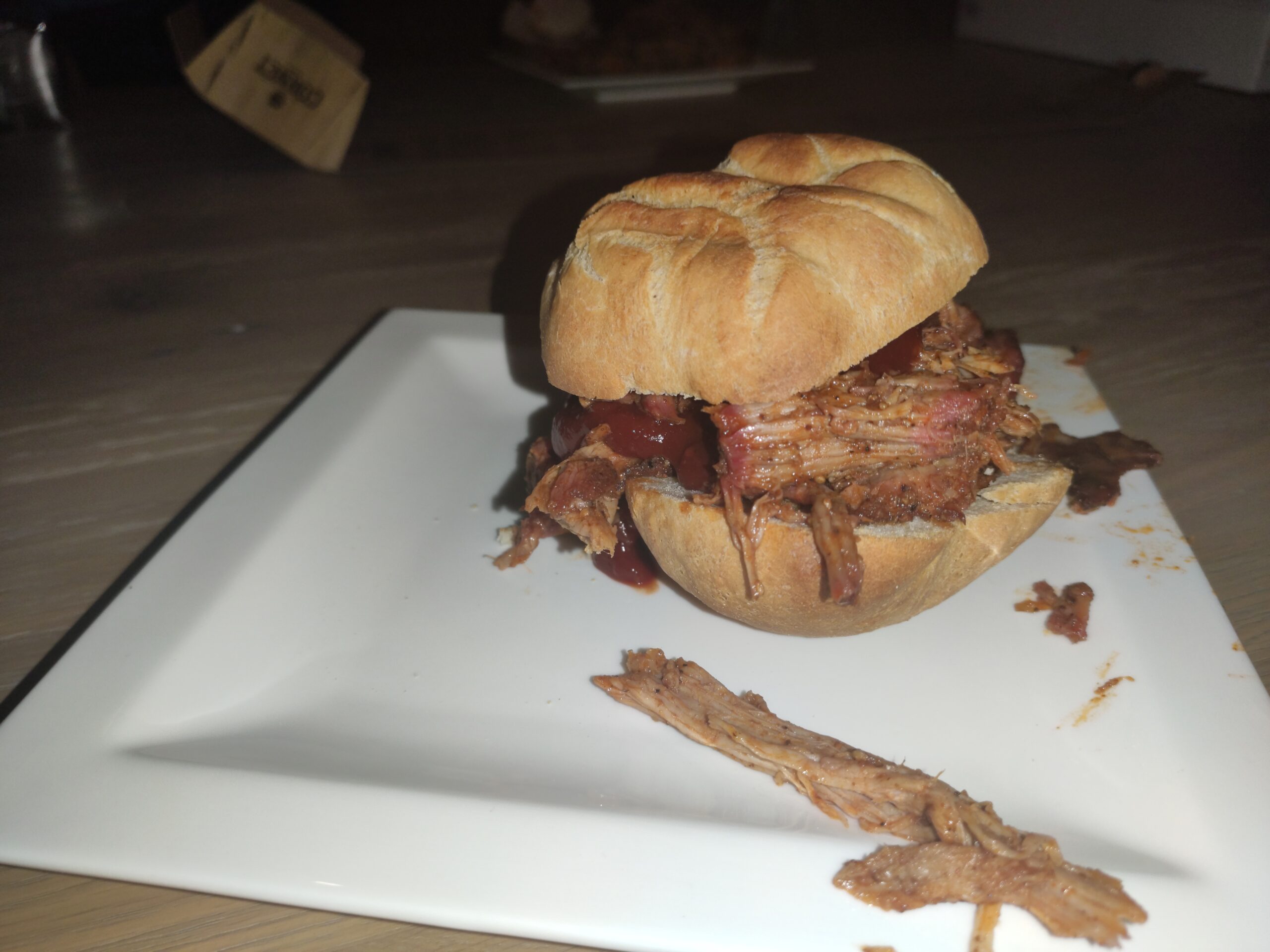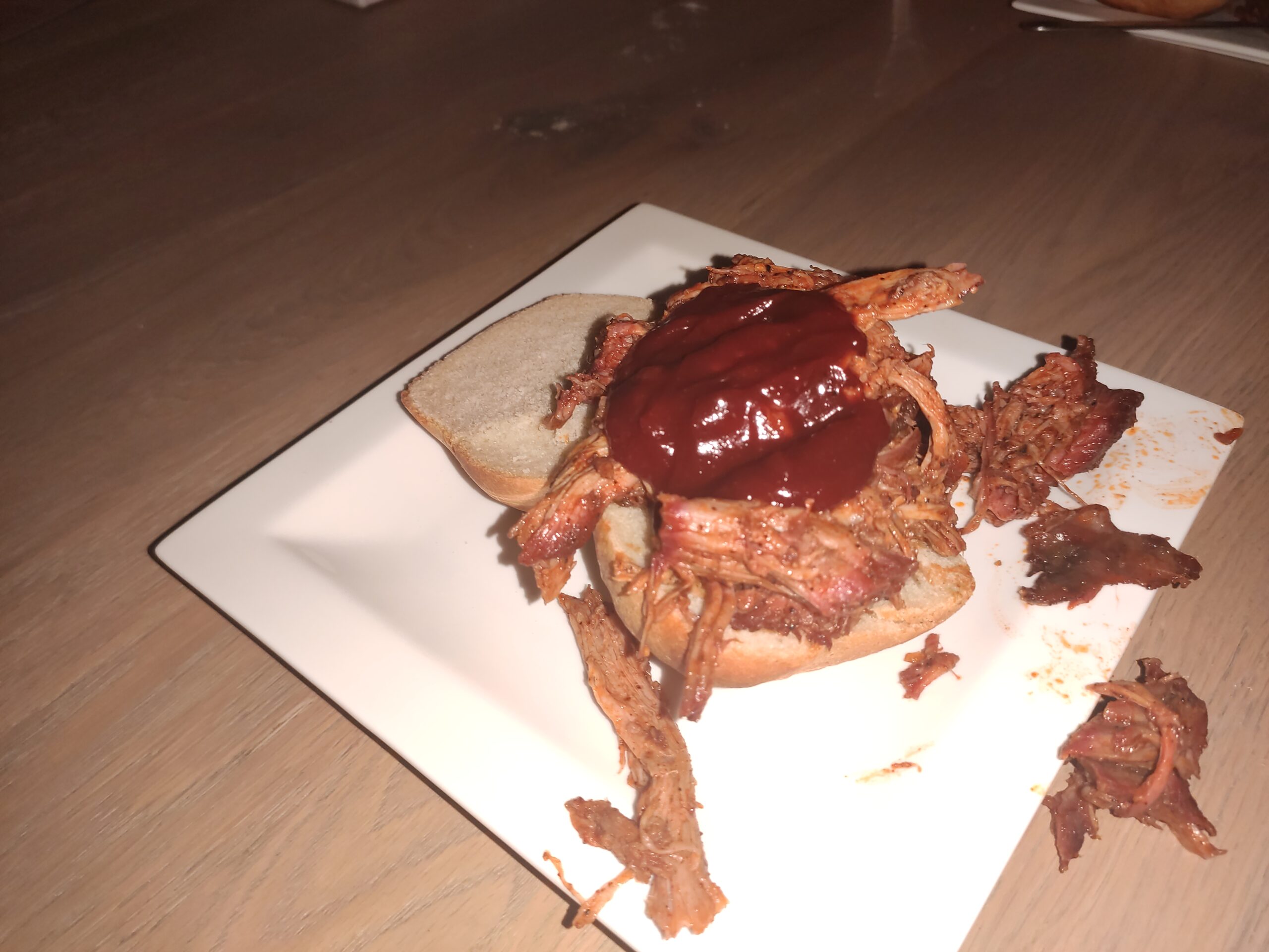 If your pulled pork is a little dry, or just needs more flavor, you can mix in extra barbecue sauce. In Gijs’s case, this was not needed.