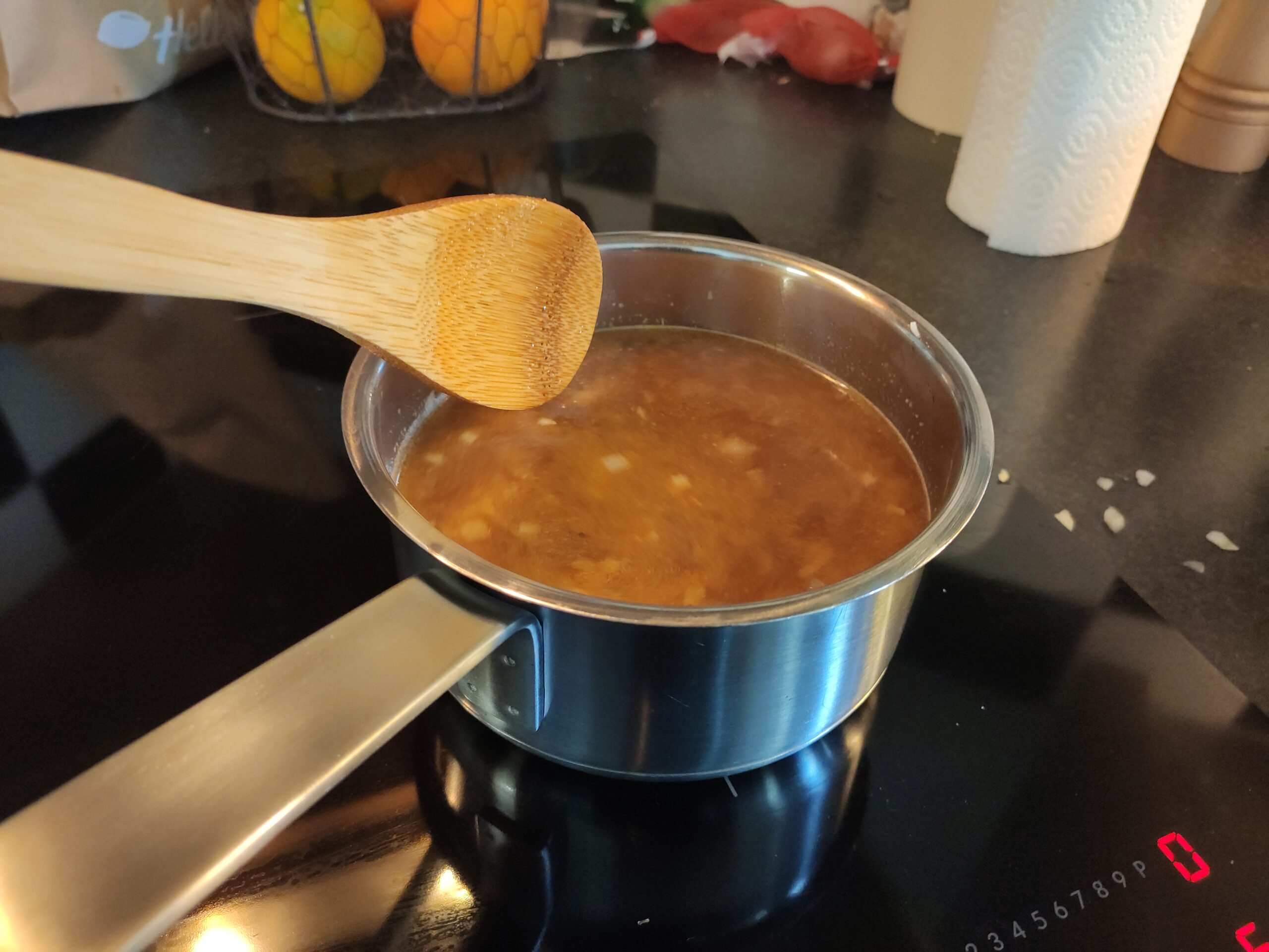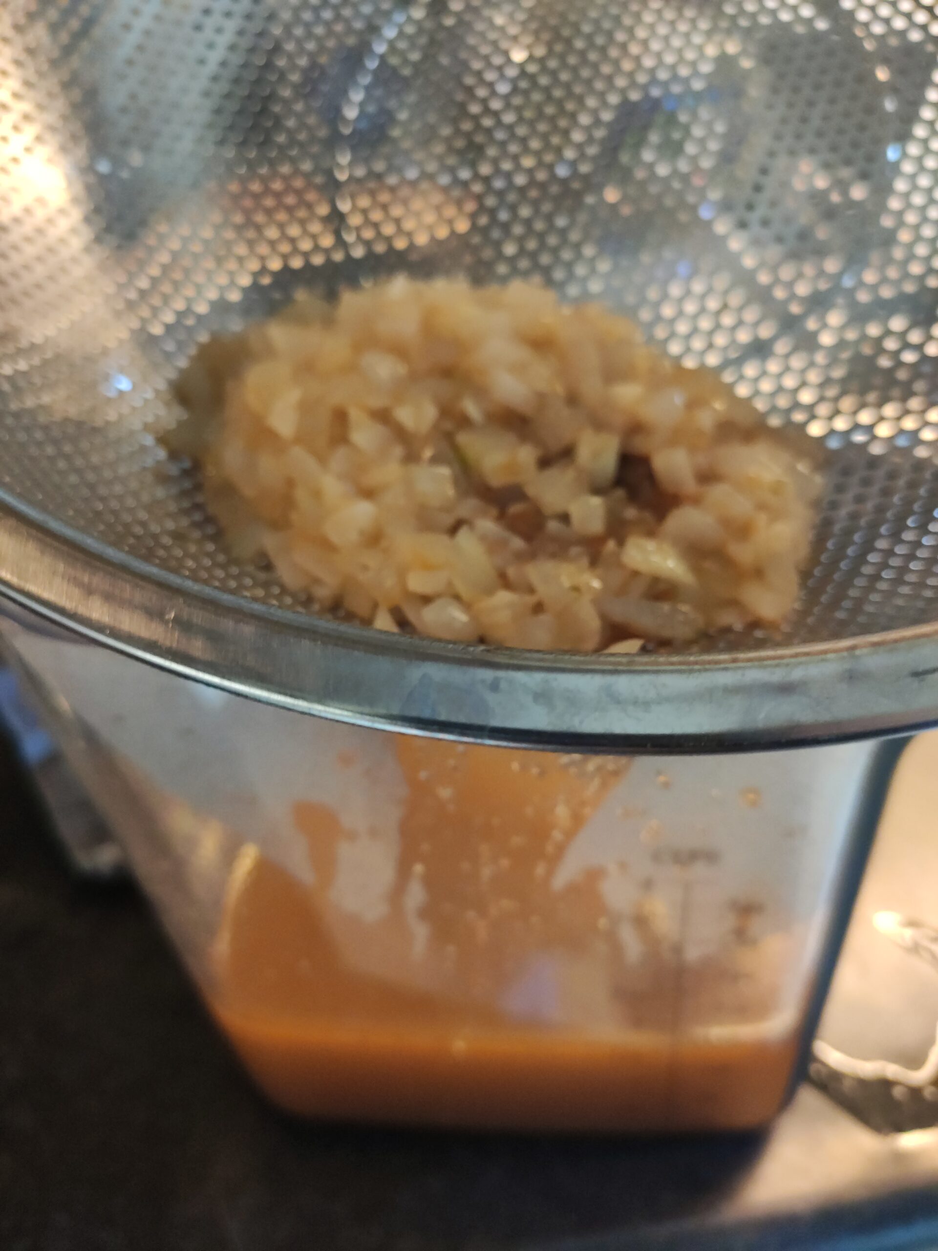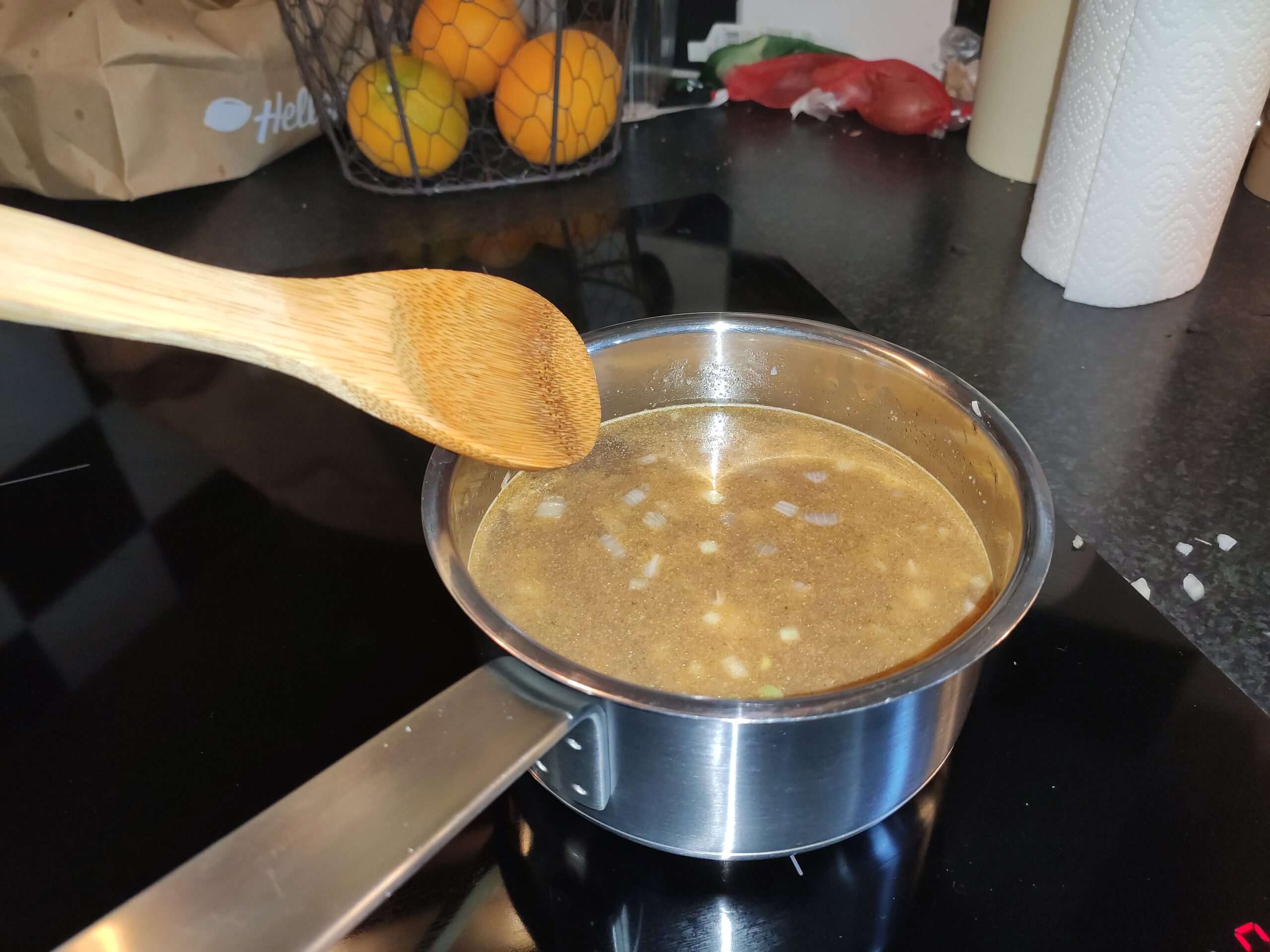 Once the onion is fully translucent, 550 ml water, one beef stock cube, and 2 teaspoons of barbecue rub are added. Gijs brings it to a boil and, once satisfied with the flavor, strains the stock to remove the onion pieces.