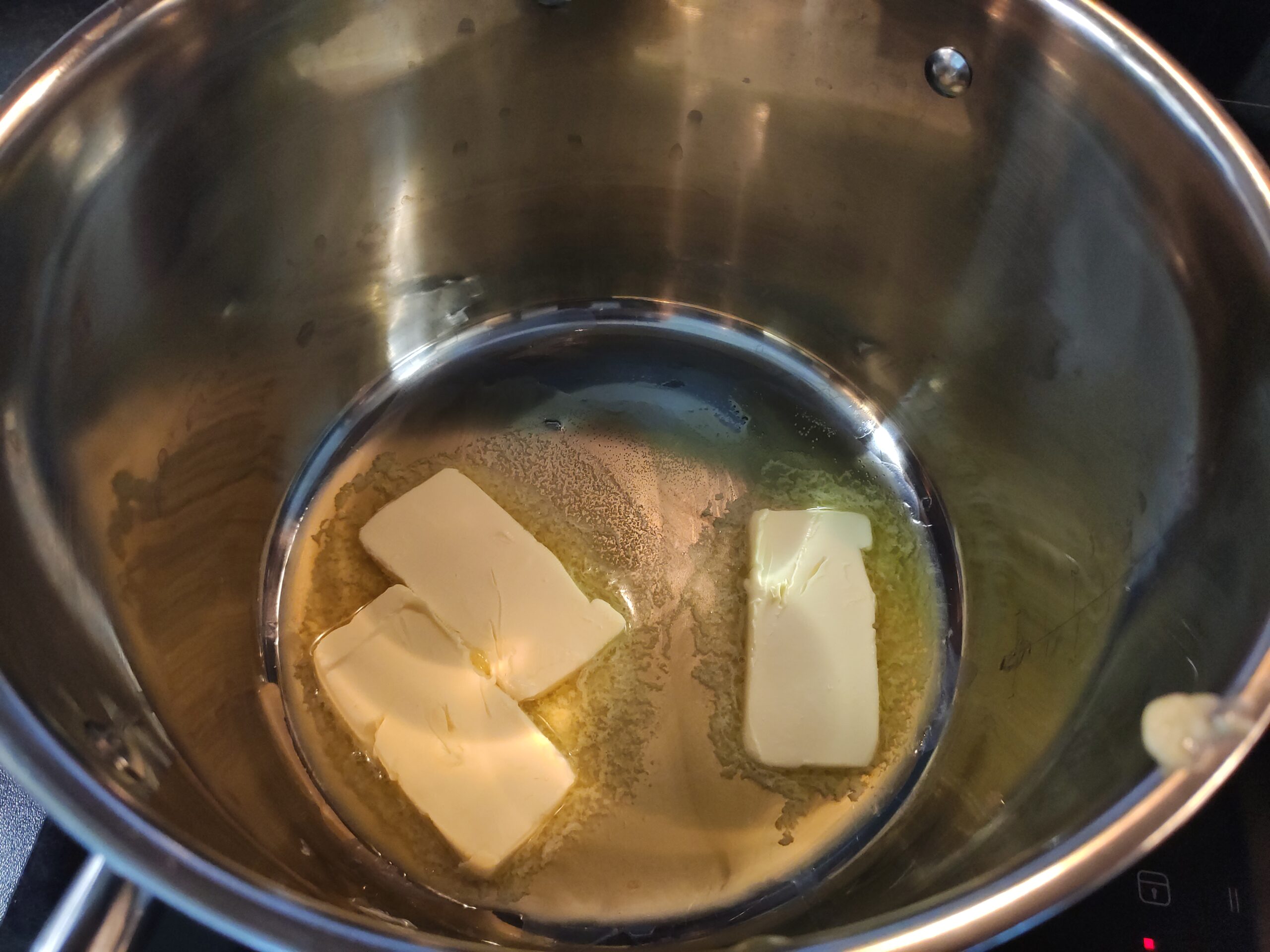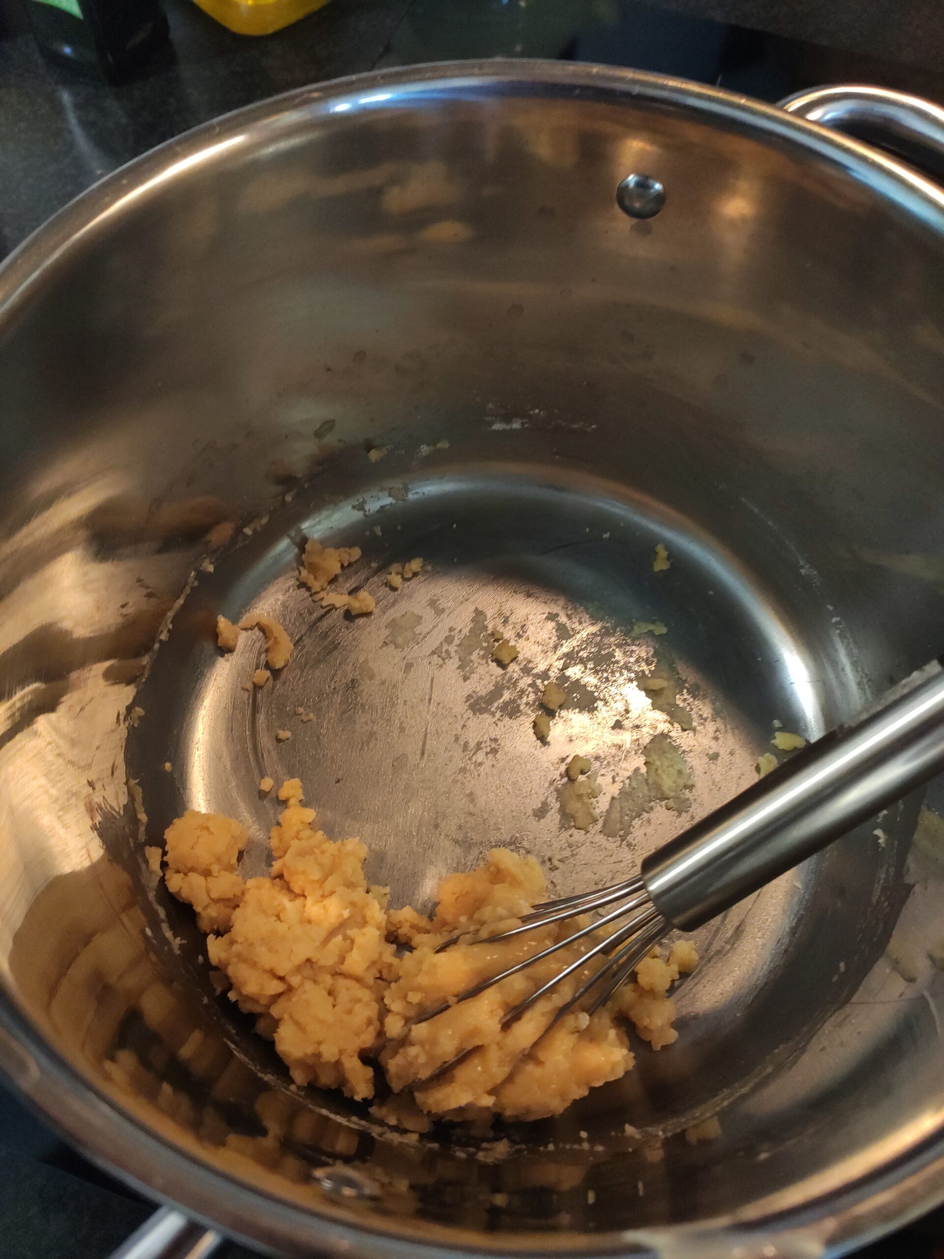 The next step is making a roux. Gijs heats the remaining 80 grams of butter until it foams but does not brown. Then he adds 100 grams of flour and stirs with a whisk until it forms a crumbly paste: the roux.