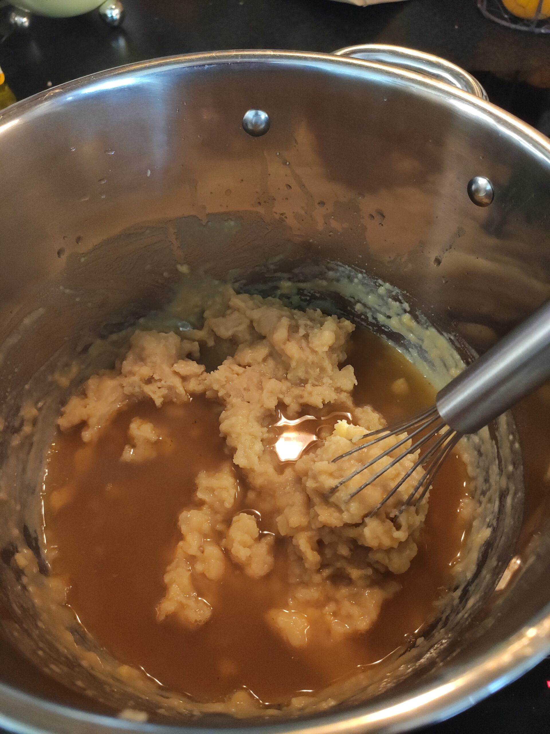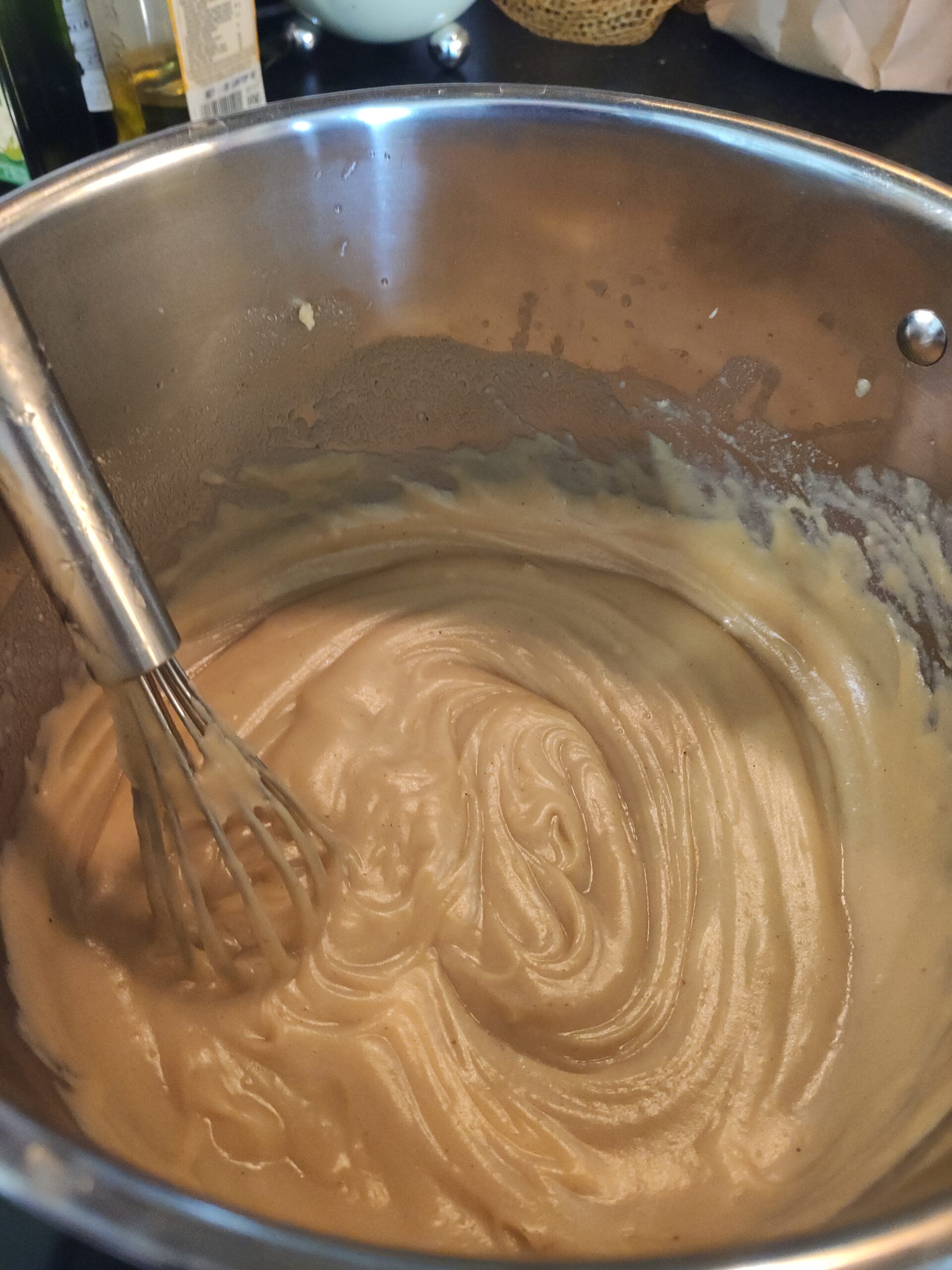 Now Gijs adds the stock to the roux little by little while stirring. He lets it simmer briefly, still stirring, until the raw flour taste is gone. While stirring, he seasons with pepper and salt. After simmering, the soaked gelatin is stirred in. This smooth mixture forms the base of our ragout.