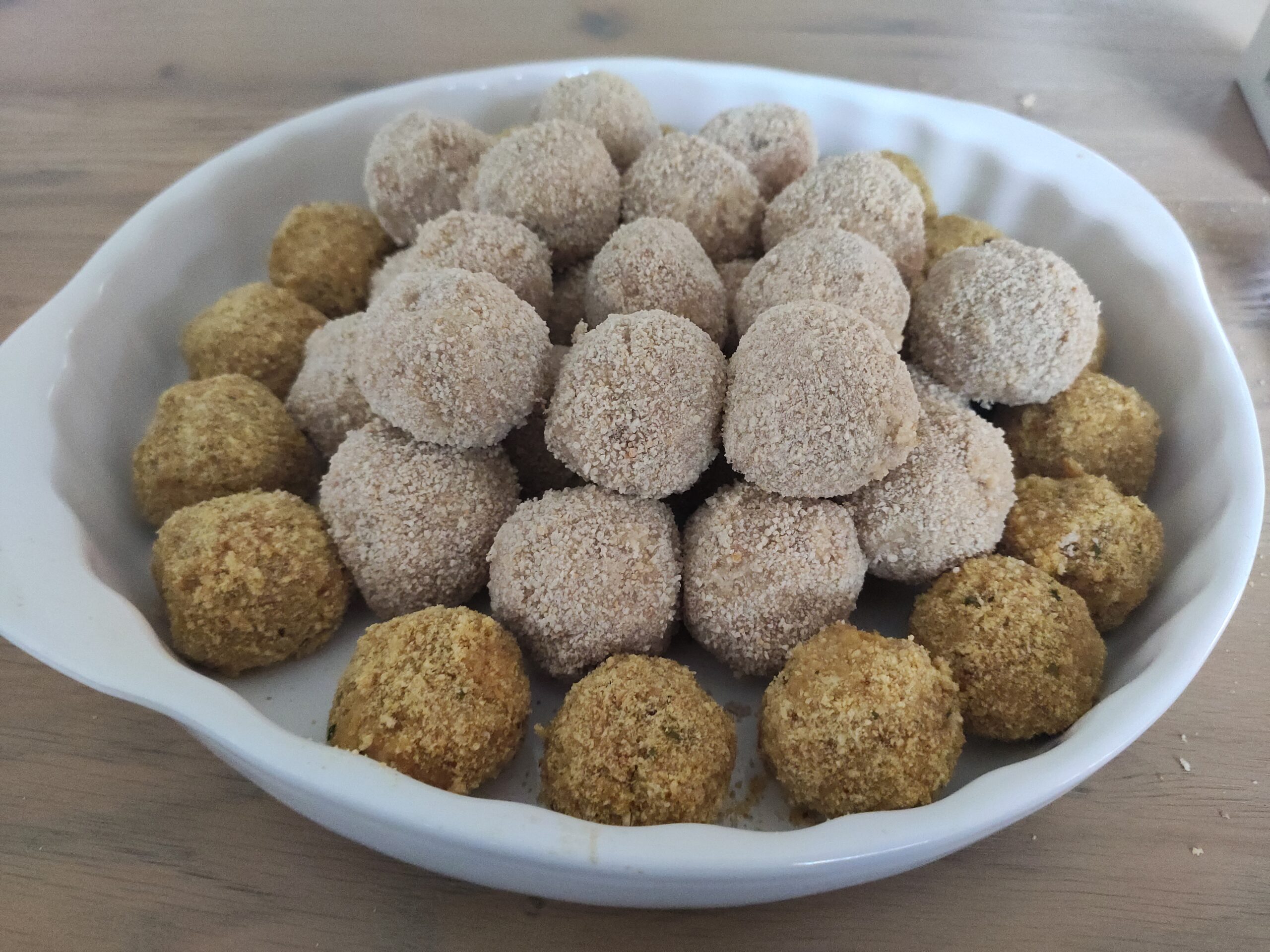 To roll nice balls, Gijs lets the ragout firm up in the freezer for about an hour. Make sure it does not fully freeze: it should stay kneadable and sticky enough to shape into balls, but firm enough not to collapse afterward. If you want to play it safe, you can also let the ragout set overnight in the fridge.